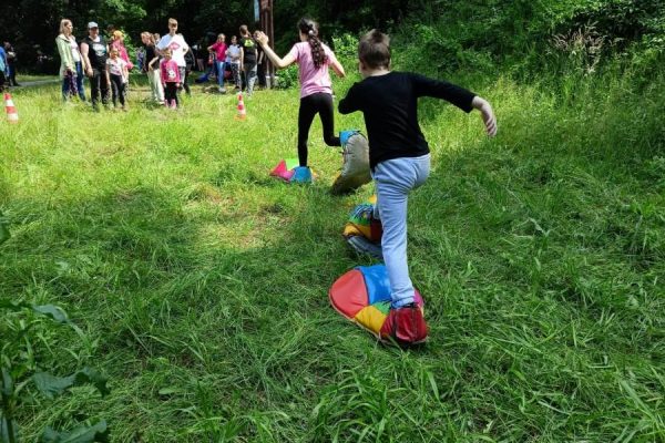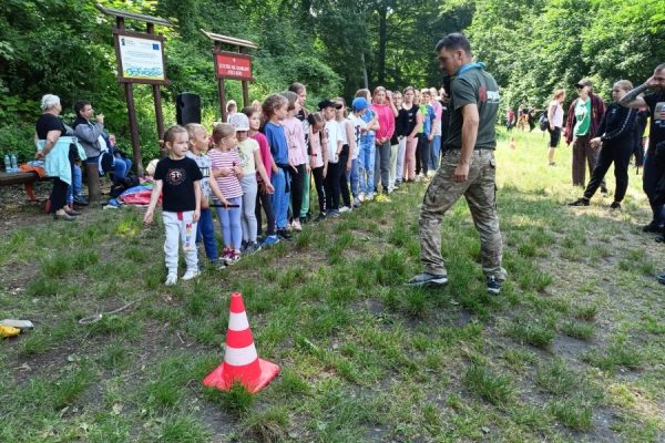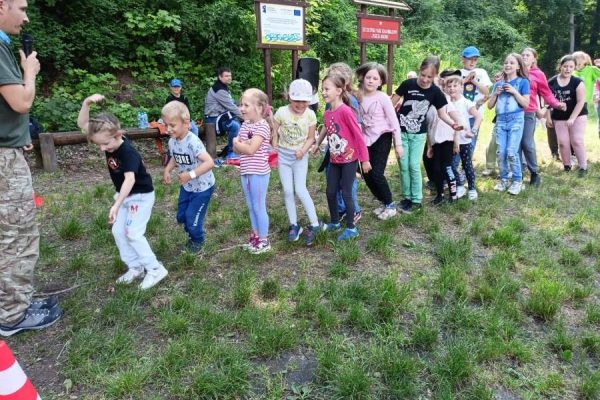 Druga część trasy rajdu była lżejsza. Zeszliśmy z powrotem przed wiadukt i przechodząc koło dawnego Zajazdu Szmaragd dotarliśmy na Polanę Słoneczną – miejsce złazu 1051 Leśnej Soboty. Tam też, po krótkim odpoczynku, rozpoczęły się gry i zabawy, które poprowadził pan Krzysztof – animator z firmy Target. Każdy z uczestników otrzymał słodkie „co nieco” i wodę, która bardzo się przydała, w ten upalny dzień.