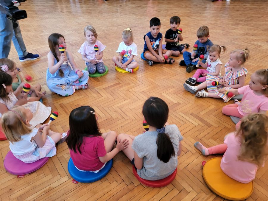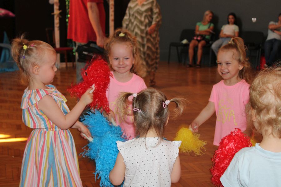 Podczas integracyjnych zabaw rytmicznych przygotowanych przez panią Igę Kamelę i pana Marcina Kurylaka (Pracownia Rozwoju Muzyczno-Ruchowego) dzieci poznały życie podwodnych żyjątek morskich, nauczyły się chodzić bokiem jak krab, chodzić wspak jak rak oraz pływać z mieniącymi się słońcem rybkami. Poznały piosenkę, w której znajdowały się najtrudniejsze do wymówienia wyrazy „kolorowa rafa koralowa”. Następnie przy użyciu instrumentów takich jak marakasy i bębenki imitowały szum fal, groźne tsunami oraz burzę z piorunami. Utrwaliły również wiedzę na temat tego jak ważne jest dbanie o środowisko i sprzątanie świata oraz jak koralowce wspomagają życie na naszej planecie.