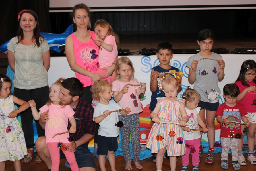Najzabawniejszym momentem była zabawa dzieci w kołyszące się na falach kolorowej chusty Klanzy stworzenia morskie, które uciekały przed rekinem. Towarzyszyli nam przy niej wszyscy zebrani rodzice, którym dziękujemy za czynny udział w imprezie.