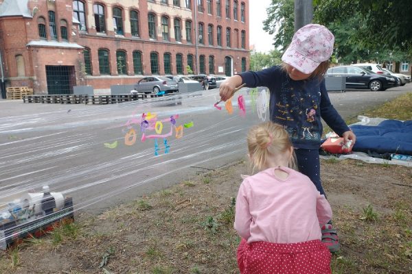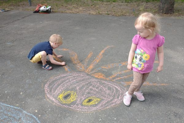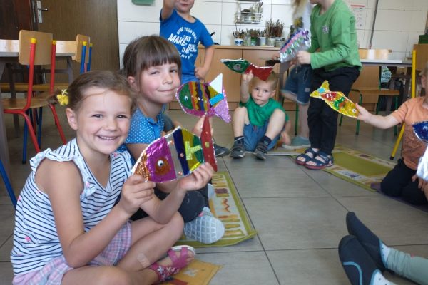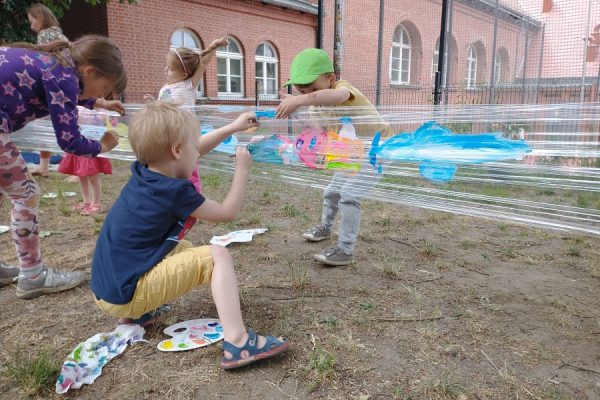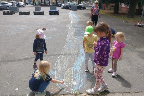 Dzieci uwielbiają poznawać życie zwierząt, a jeszcze bardziej lubią je rysować. Tym razem oprócz rysunków na kartkach powstały obrazy na boisku i na przezroczystej folii – ośmionoga ośmiornica oraz 23-metrowy młody płetwal błękitny! Niestety, letni deszcz pozwolił mu odpłynąć… pewnie do oceanu 😉
