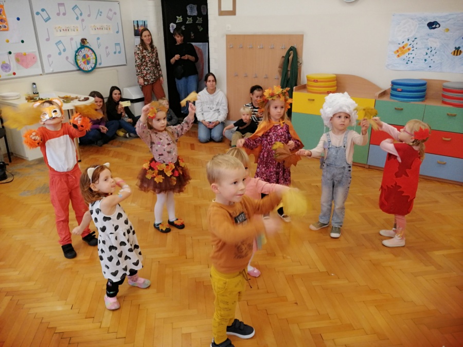 Przygotowaliśmy dla naszych uczestników moc atrakcji. Były tańce do jesiennych przebojów, nauka choreografii z wykorzystaniem chust animacyjnych, quiz wiedzy o jesieni, konkursy, wspólne muzykowanie oraz śpiewanie jesiennych piosenek. Starsze grupy wykonały pracę plastyczną wg własnego pomysłu.