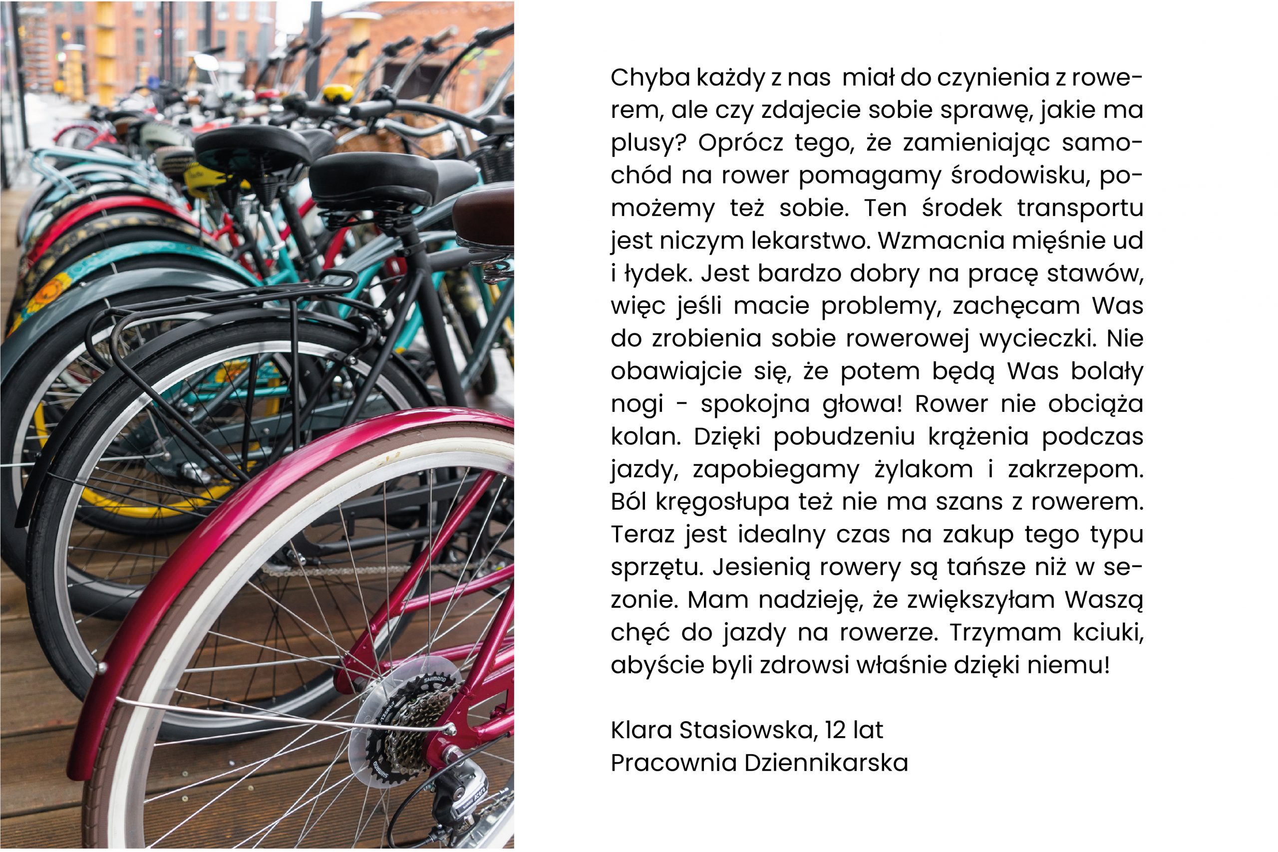 Chyba każdy z nas miał do czynienia z rowerem, ale czy zdajecie sobie sprawę, jakie ma plusy? Oprócz tego, że zamieniając samochód na rower pomagamy środowisku, pomożemy też sobie. Ten środek transportu jest niczym lekarstwo. Wzmacnia mięśnie ud i łydek. Jest bardzo dobry na pracę stawów, więc jeśli macie problemy, zachęcam Was do zrobienia sobie rowerowej wycieczki. Nie obawiajcie się, że potem będą Was bolały nogi – spokojna głowa! Rower nie obciąża kolan. Dzięki pobudzeniu krążenia podczas jazdy, zapobiegamy żylakom i zakrzepom. Ból kręgosłupa też nie ma szans z rowerem. Teraz jest idealny czas na zakup tego typu sprzętu. Jesienią rowery są tańsze niż w sezonie. Mam nadzieję, że zwiększyłam Waszą chęć do jazdy na rowerze. Trzymam kciuki, abyście byli zdrowsi właśnie dzięki niemu!
