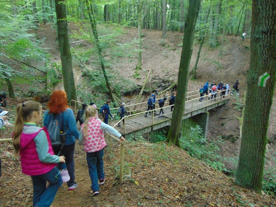 O godz. 10.00 wyruszyliśmy na szlak, który prowadził przez urocze zielone tereny Lasku Arkońskiego. Przechodząc wzdłuż doliny strumienia Zielonka musieliśmy zachować ostrożność, bo droga prowadziła przy urwisku. Niektórych ucieszył fakt, że w lesie pojawiły się już grzyby.