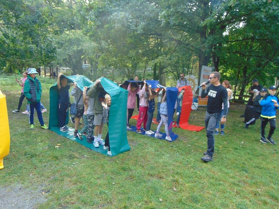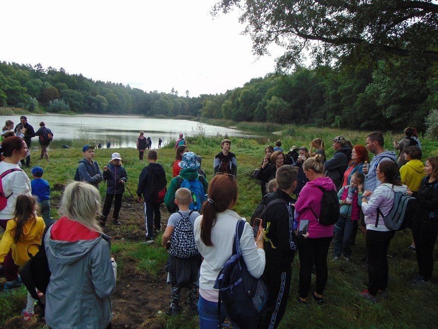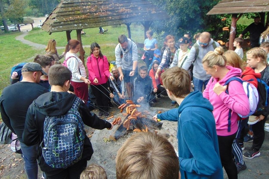 Małą przerwę na odpoczynek zrobiliśmy sobie na polanie przy jeziorze Goplana. Nie siedzieliśmy tam jednak za długo, bo na Polanie Czerwonej czekało na młodzież wiele atrakcji. Już po drodze czuliśmy dym z rozpalonego ogniska, a to oznaczało, że będą kiełbaski i mnóstwo dobrej zabawy – konkursy, quizy, które przygotował i poprowadził animator pan Łukasz Wójcik z firmy 4 seasons. Emocji i śmiechu było wiele. Każdy uczestnik zjadł pyszną kiełbaskę i po zakończonej zabawie, z wieloma nagrodami zdobytymi w konkursach, rozeszliśmy się do domów.