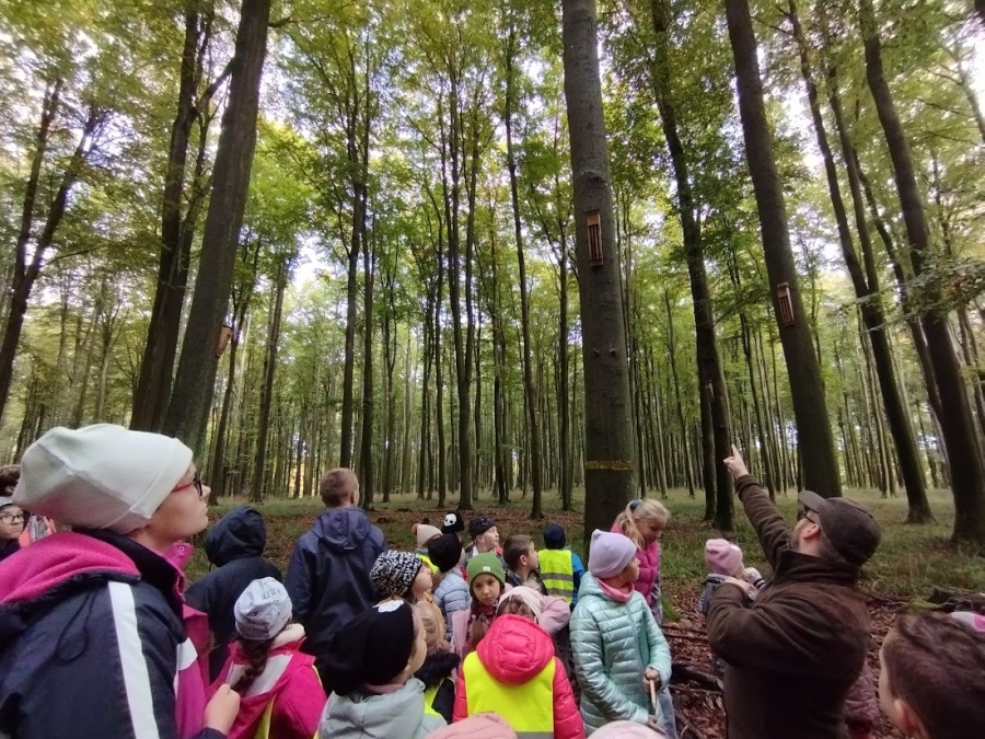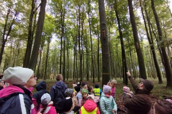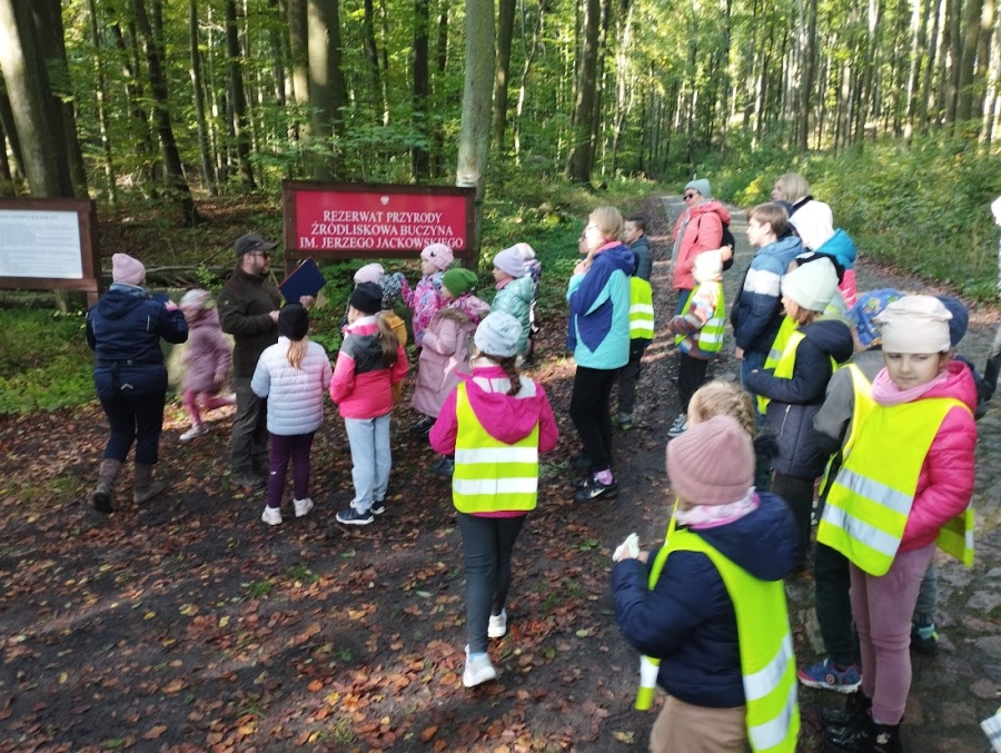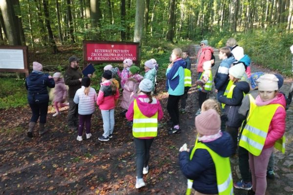 Następnie grupa udała się na krótki spacer do Rezerwatu Źródliskowa Buczyna, gdzie Pan Marcin Dziubak objaśniał czym się charakteryzuje takie miejsce i na co warto zwrócić uwagę przebywając na terenie rezerwatu. Dowiedzieliśmy się ile jest rezerwatów na terenie nadleśnictwa i już wiemy co zrobić, gdy zgubimy się w lesie oraz kto mieszka w tajemniczych, podłużnych budkach na drzewach. Dzieci zobaczyły z bliska jak wyglądają owoce buku i usłyszały wiele ciekawych informacji na temat Rezerwatu Źródliskowa Buczyna. Swoją wiedzę mogły sprawdzić wypełniając pod koniec warsztatów krótki test.