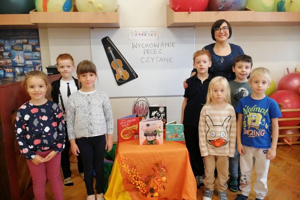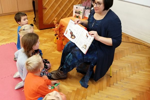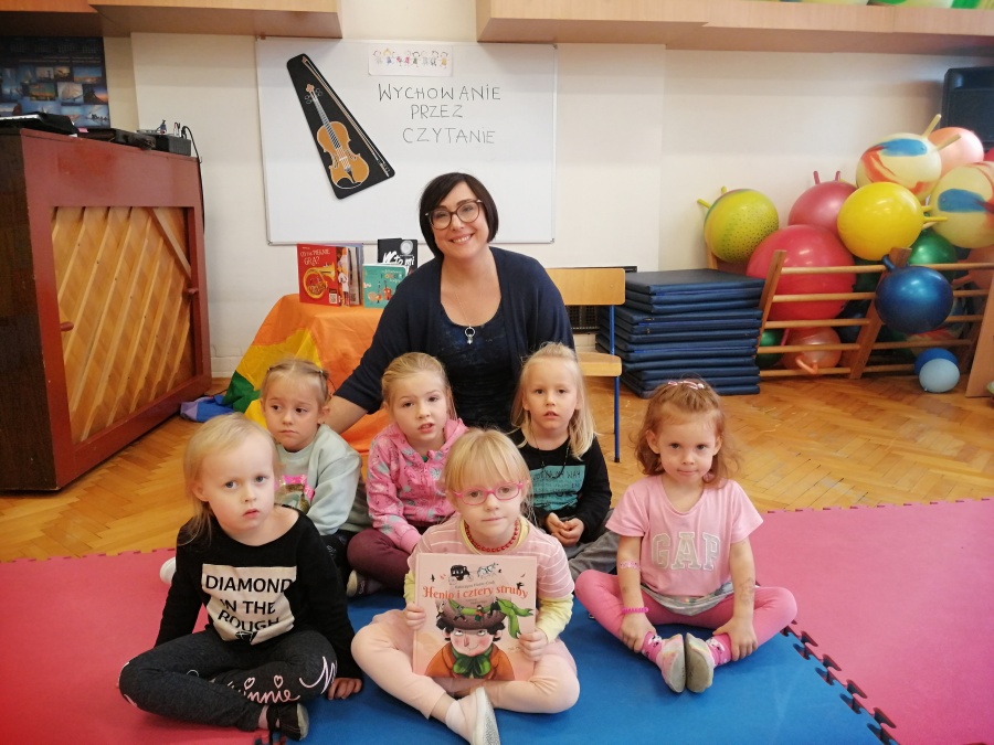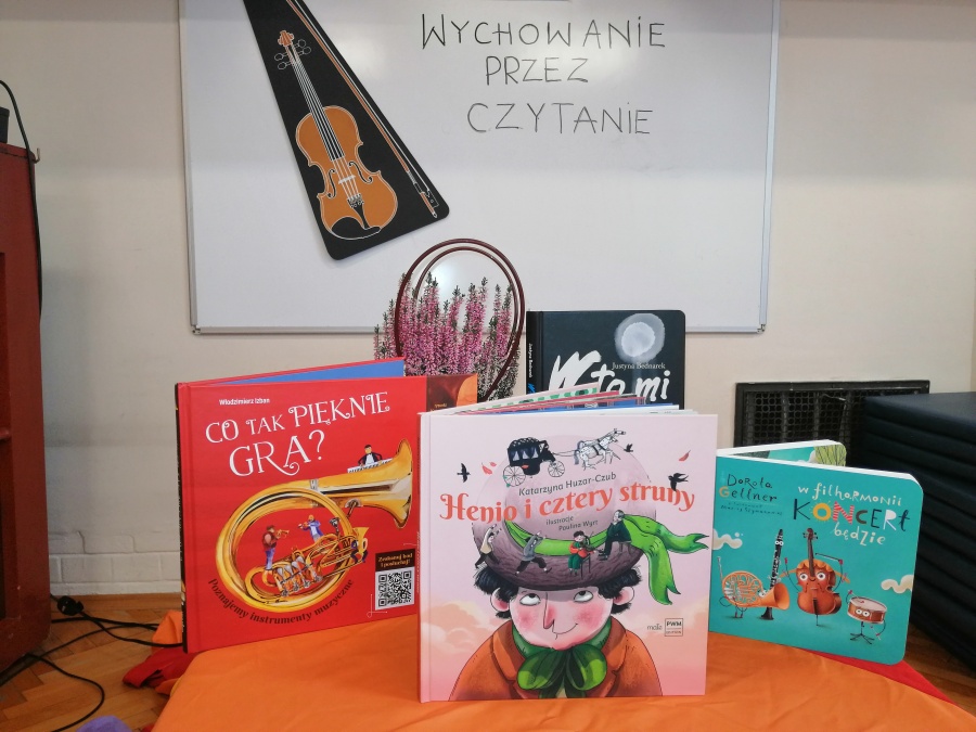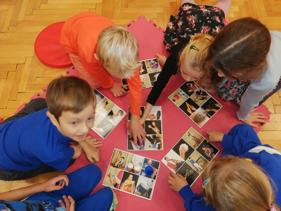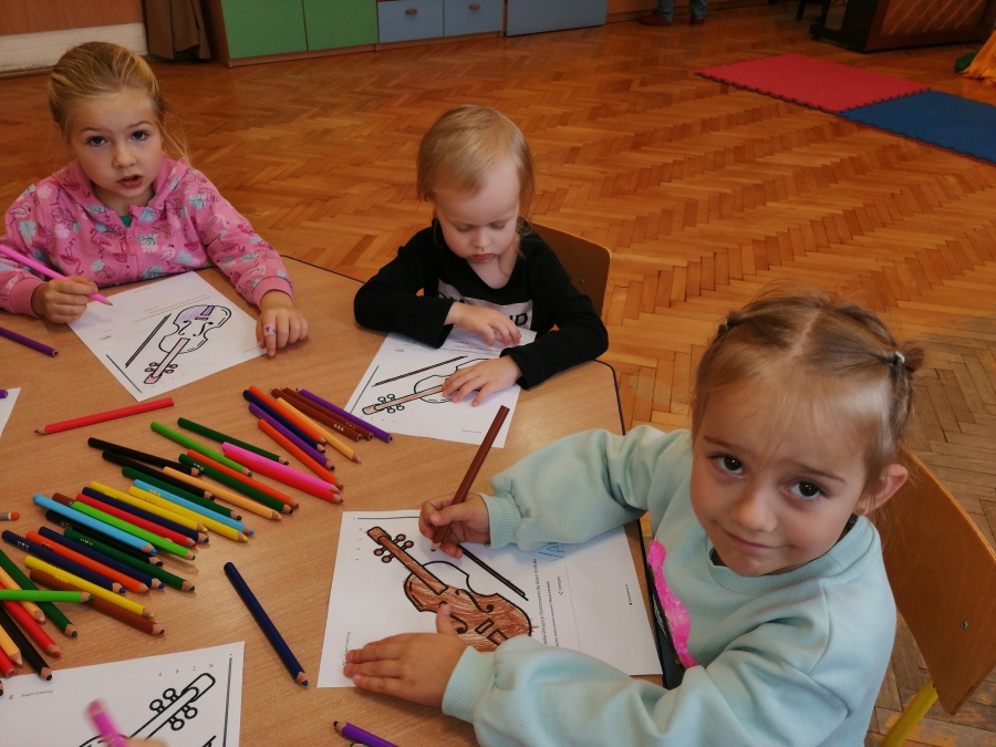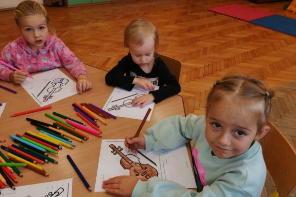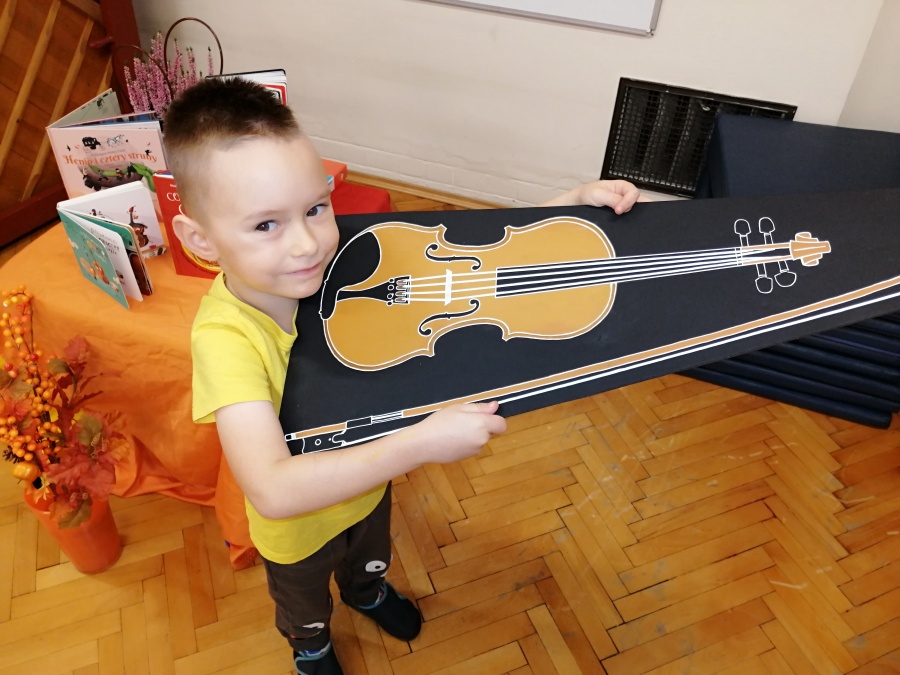 Po lekturze, dzieci wysłuchały koncertu w wykonaniu orkiestry symfonicznej „Wiosna” A. Vivaldiego oraz „Obertasa” H. Wieniawskiego. Poznały również budowę skrzypiec oraz smyczka. Instrumenty występujące w orkiestrze dzieci rozpoznawały po dźwiękach i wykazując się refleksem odnajdywały pasujący do dźwięku obrazek podczas zabawy w loteryjkę muzyczną. Były też swobodne improwizacje ruchowe z wykorzystaniem chust animacyjnych do „Jesieni” Antonio Vivaldiego oraz gra na instrumentach perkusyjnych do tegoż utworu.