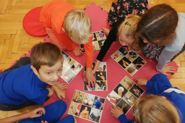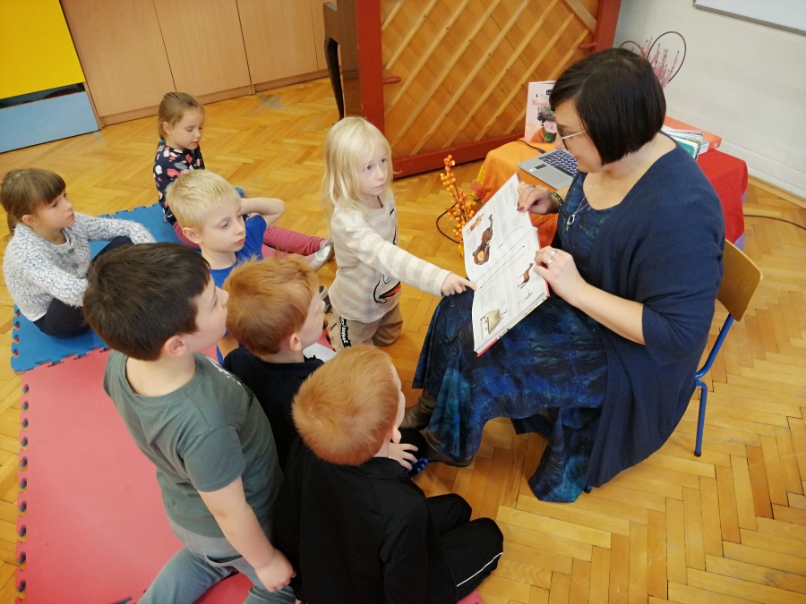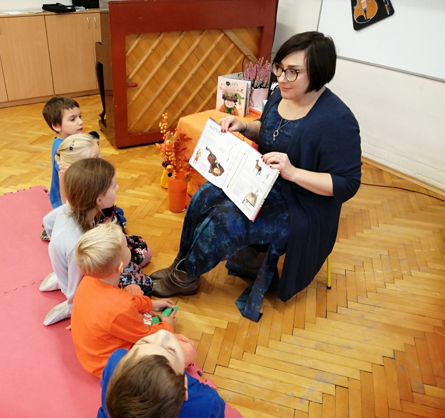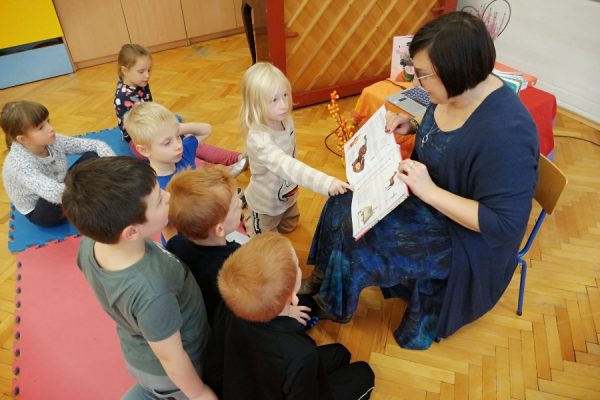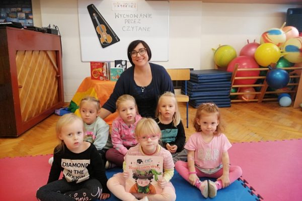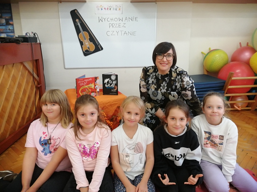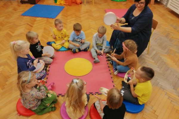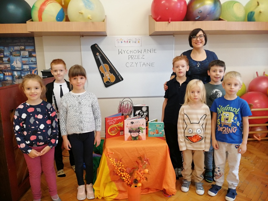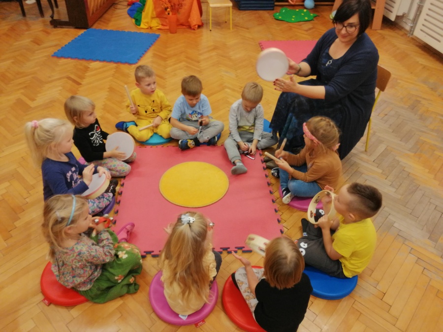 Po lekturze, dzieci wysłuchały koncertu w wykonaniu orkiestry symfonicznej „Wiosna” A. Vivaldiego oraz „Obertasa” H. Wieniawskiego. Poznały również budowę skrzypiec oraz smyczka. Instrumenty występujące w orkiestrze dzieci rozpoznawały po dźwiękach i wykazując się refleksem odnajdywały pasujący do dźwięku obrazek podczas zabawy w loteryjkę muzyczną. Były też swobodne improwizacje ruchowe z wykorzystaniem chust animacyjnych do „Jesieni” Antonio Vivaldiego oraz gra na instrumentach perkusyjnych do tegoż utworu.