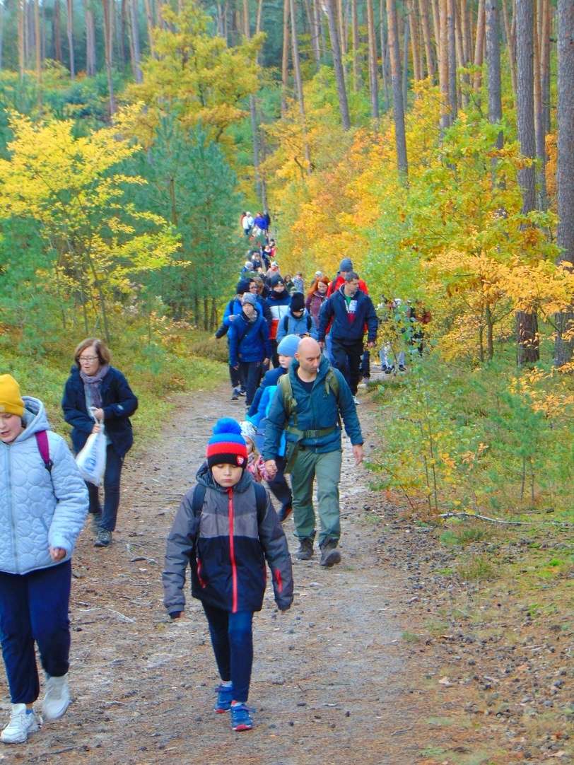 W chłodną ale słoneczną sobotę, 28 października, na parkingu leśnym przy Bartoszewie zebrało się ponad 100 miłośników Leśnych Sobót, aby wspólnie wędrować ścieżkami Puszczy Wkrzańskiej. Pogoda była wspaniała. Żółtym szlakiem dotarliśmy do wsi Bartoszewo. W centrum weszliśmy na szlak czerwony, minęliśmy urokliwe w jesiennej szacie jezioro, o tej samej nazwie co wieś, i dalej szliśmy w kierunku Tanowa. Po drodze zapaleni grzybiarze szukali w lesie grzybów. Było trochę podgrzybków, maślaków i piękne muchomory. W Tanowie skręciliśmy na czarny szlak, którym dotarliśmy do Komorzych Gór. Z nazwy to góry, a tak naprawdę to są wydmy śródleśne o wysokości ok. 40 m n.p.m. Ciężko było przebrnąć piaszczyste wzniesienie. Dzielnie pokonała je 4 – letnia Julia, która wędrowała z tatą. Warto było zmęczyć się, bo widok z góry był wspaniały! Końcowy odcinek rajdu przeszliśmy sprawnie i mogliśmy odpocząć na kłodach ściętych drzew przy Leśniczówce Stare Leśno. Tam zakończyła się 1054 Leśna Sobota. Po krótkim odpoczynku, w wyśmienitych humorach, ruszyliśmy na parking w Bartoszewie, skąd autobusami wróciliśmy do domów.