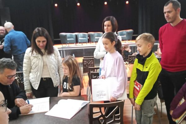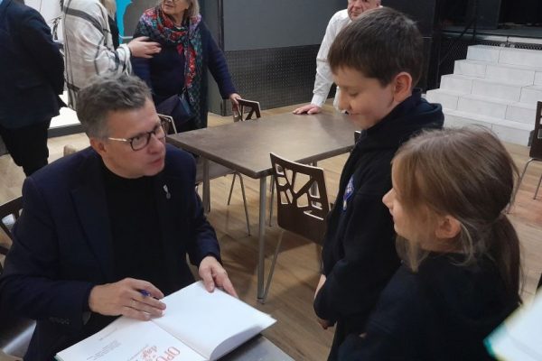 Pałacowa grupa wręczyła Markowi Michalakowi laurkę zapewniającą o znajomości prawa do czasu wolnego. Otrzymaliśmy również autograf w książce „Opowieści o prawach dziecka”, którą będziemy wykorzystywać na naszych zajęciach plastycznych. Autor zachęcił naszych Uczestników i Uczestniczki do ilustrowania swoich opowiadań. Na pewno zmierzymy się z tym tematem!