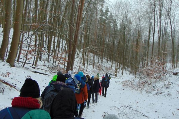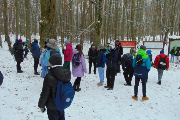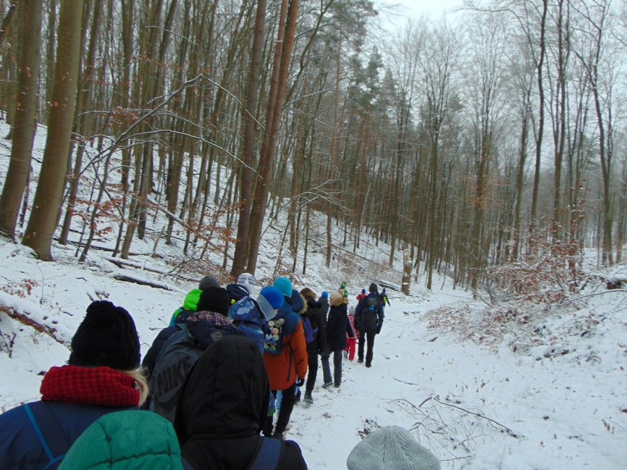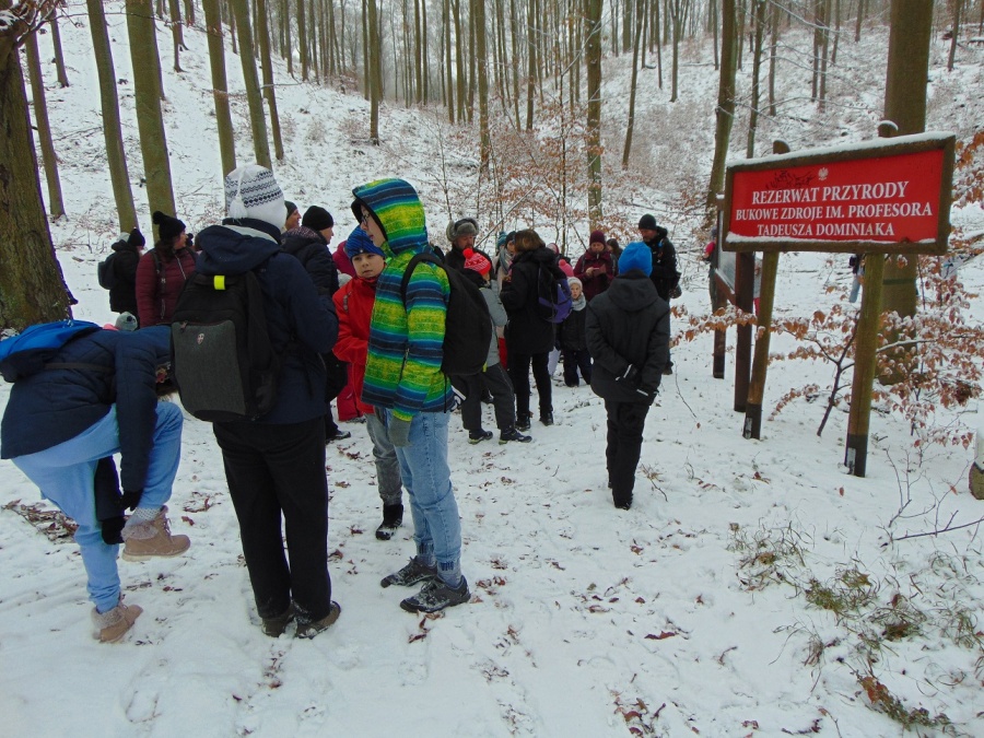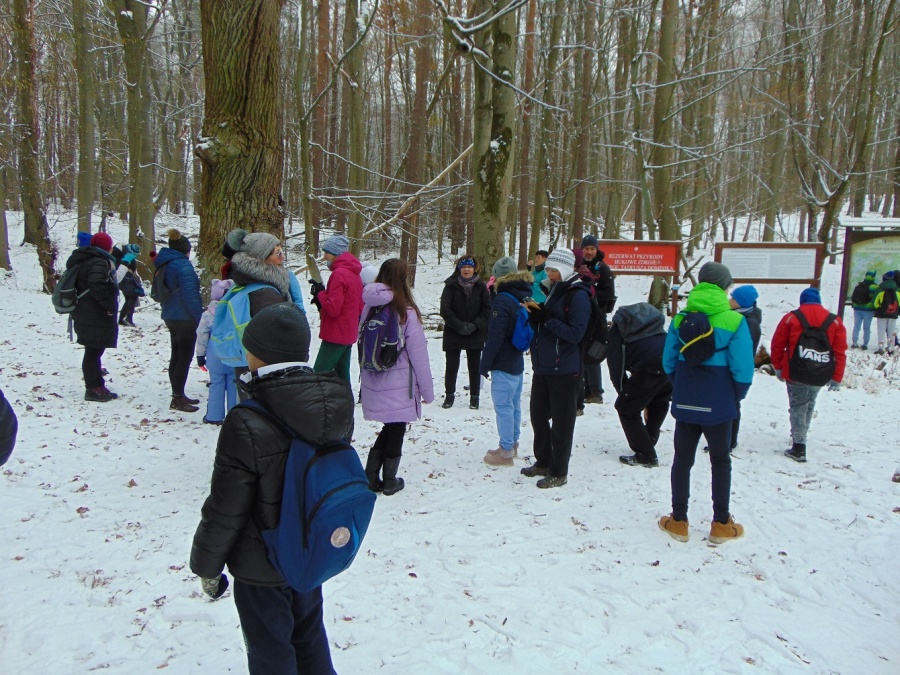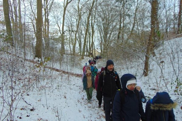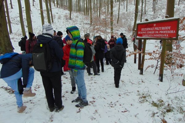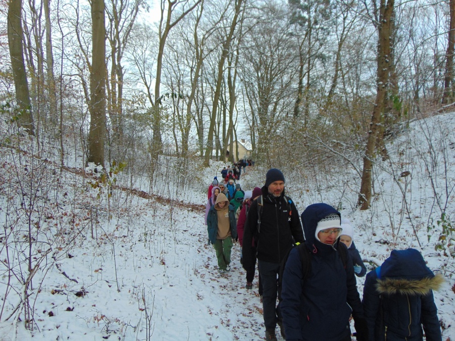 W sobotę, 2 grudnia wędrowaliśmy po Puszczy Bukowej. Wędrówkę rozpoczęliśmy na dworcu Podjuchy. Czarnym szlakiem, w dobrych humorach – mimo zimowej już pogody i lekkiego mrozu, ruszyliśmy do puszczy. Celem naszej wędrówki było Oczko Marzanny – węzeł szlaków niebieskiego i zielonego. Pogoda była mroźna i nawet zaświeciło nam słońce. Pierwszy odpoczynek był pod wiaduktem autostrady na ul. Smoczej. Tu pożegnaliśmy czarny szlak i żółtym szlakiem dotarliśmy do polanki Psie Pole, na której rośnie pomnikowy dąb Myśliwych, nazywany też Psim Dębem. Stąd zeszliśmy niebieskim szlakiem do miejsca złazu – Oczka Marzanny, źródła strumienia Chojnówka.