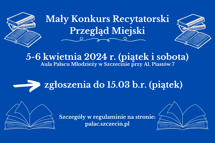 Pałac Młodzieży w Szczecinie zaprasza do udziału w Małym Konkursie Recytatorskim uczniów szkół podstawowych, uczestników domów kultury i placówek zajęć pozaszkolnych. Przegląd Miejski odbędzie się w dniach 5-6 kwietnia 2024 r. (piątek, sobota)