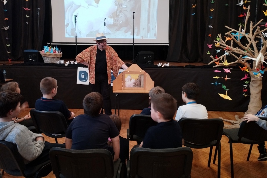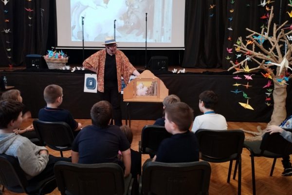 W międzyczasie młodsi uczestnicy wydarzenia mogli posłuchać historii opowiadanych przy pomocy Teatrzyku Kamishibai, o co zadbał Marcel Mroczek, nauczyciel Pracowni Teatralnej.