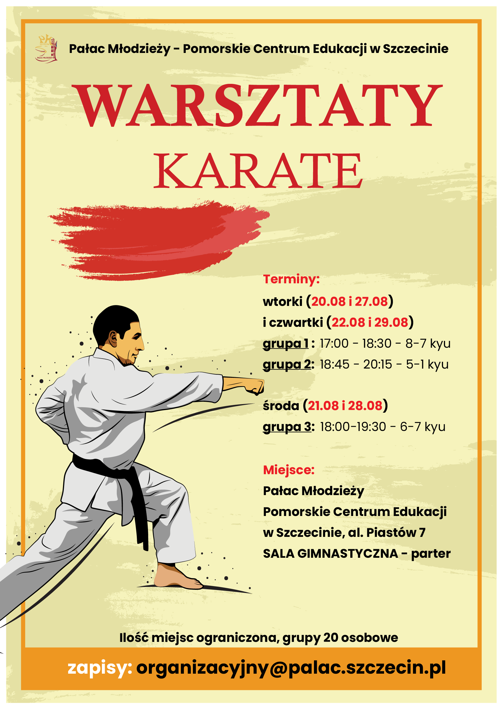 W okresie 20 – 29 sierpnia br. zapraszamy chętnych na warsztaty karate, które odbędą się w siedzibie Pałacu Młodzieży.