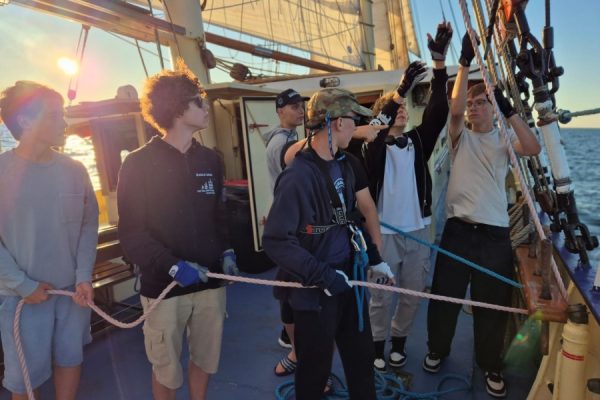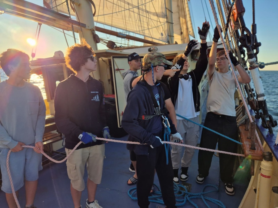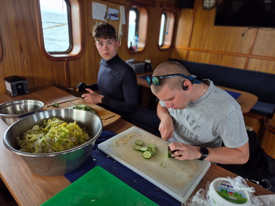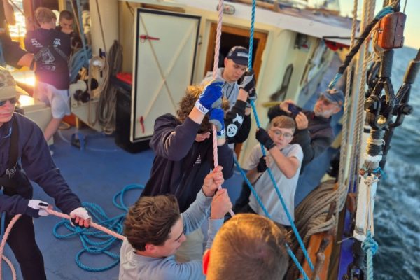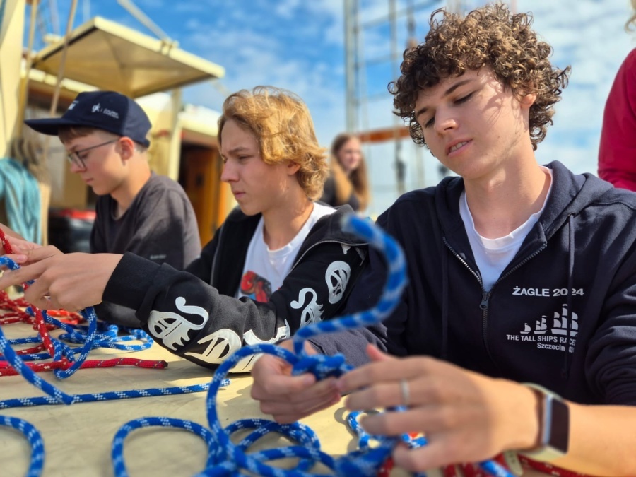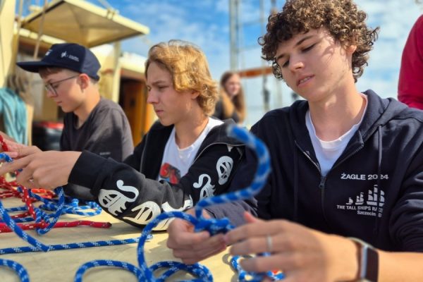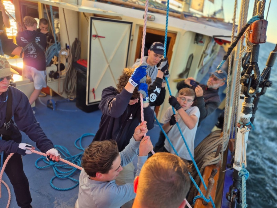 Po drodze odbył się znowu cykl szkoleń. Przećwiczono manewr „człowiek za burtą” z prawdziwym człowiekiem (kuk w kombinezonie “wypadł” ćwiczebnie za burtę). Dostarczyło to wiele emocji i pokazało, jak ciężko jest wyciągnąć z wody i przetransportować poszkodowanego na pokład. Młodzież również mogła posłuchać wykładu z podstaw teorii żeglowania. I znowu, kolejnego dnia, ruszyliśmy w kierunku naszego portu docelowego w tym etapie.