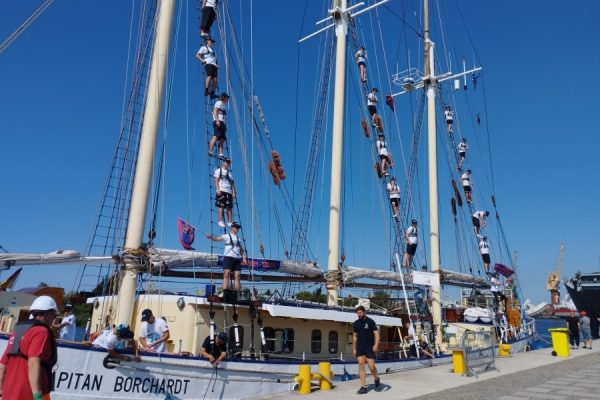 Zanim zacumowaliśmy w naszym porcie macierzystym, po drodze nastąpił klar jednostki. Trzeba było uporządkować żagle, czyli zrobić klar portowy oraz to samo zrobić ze wszystkimi linami znajdującymi się na pokładzie. Nasza praca została przerwana na krótki moment. Mijając Stację Pilotów zostaliśmy mile przywitani odegranym hymnem Polski oraz “pokłonem banderą”. Załoga chwilkę wcześniej ustawiła się w dwuszeregu w postawie zasadniczej, zdjęła czapki z głów i godnie wysłuchała odegranego hymnu. Dyżurny żeglarz, na komendę kapitana, również ”pokłonił się banderą”, zgodnie z zasadami ceremoniału morskiego . Po tej krótkiej chwili załoga wróciła do swoich zadań porządkowych. Musiał się spieszyć, gdyż do portu mieliśmy wpłynąć z “paradą na wantach”. Wyznaczona młodzież zajęła w odpowiednim szyku swoje pozycje na drabinkach, na wantach w strojach Edukacji Morskiej. Z brzegu takie elementy zawsze podobają się zwiedzającym i witającym żaglowce. Reszta załogi szykowała się do manewrów portowych. Zacumowaliśmy 01 sierpnia 2024 o godzinie 15:00. Ten moment uwieczniła ekipa filmowa ze strony naszego sponsora – Centrum Handlowego Kaskada.