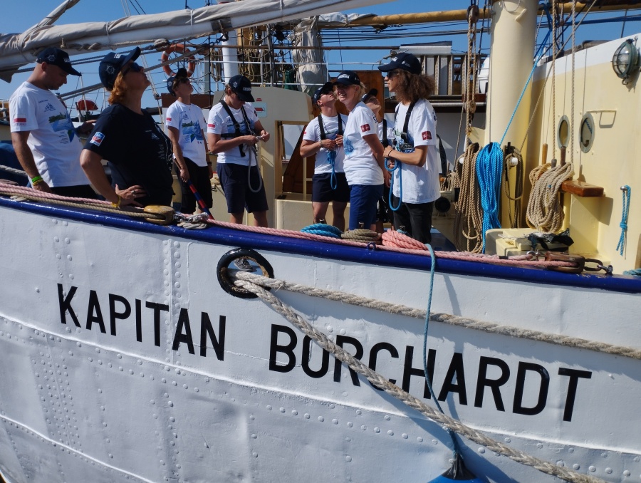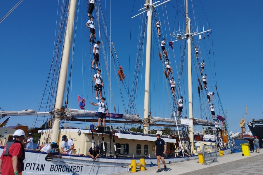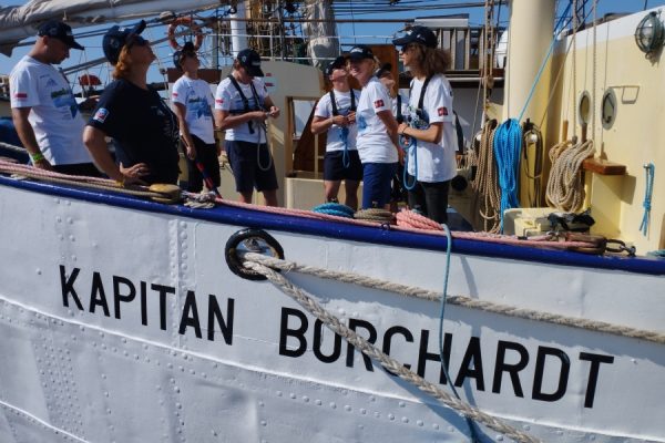 Do Gdańska ruszyliśmy zgodnie z planem. Trasa nie była jakoś zbyt męcząca. To tylko około 370 km spokojnej jazdy z kilkoma postojami. Do Gdańska zajechaliśmy w godzinach wczesnopopołudniowych. O godzinie 14 zostaliśmy zamustrowani w skład załogi STS Kapitan Burchardt. Zbiórka wszystkich na pokładzie i pierwsze spotkanie z kapitanem, bosmanem, mechanikiem, kukiem oraz oficerami. Przydzielono nas do wacht. Załoga stała dokonała zapoznania z żaglowcem oraz regulaminami, obsługą urządzeń, korzystania z sanitariatów, bezpiecznego poruszania się po pokładzie oraz klatkach schodowych i z wieloma innymi informacjami potrzebnymi dla nas, aby nie zrobić krzywdy sobie ani – teraz już naszemu – Kapitanowi Borchadtowi.