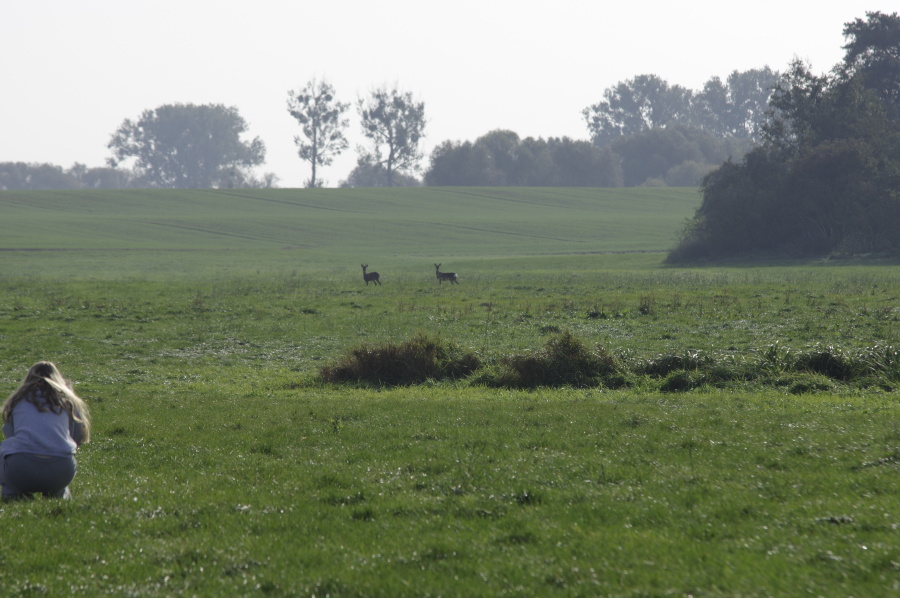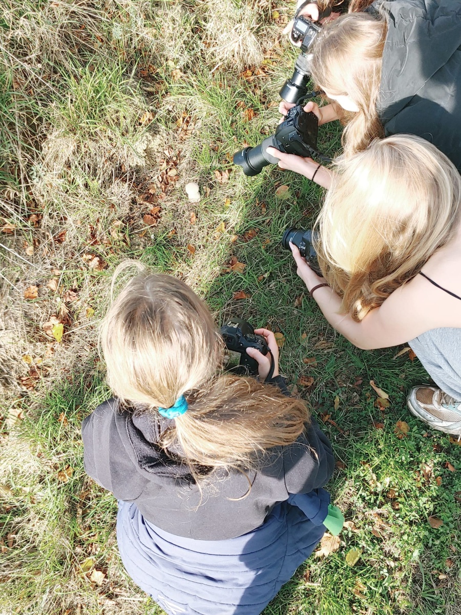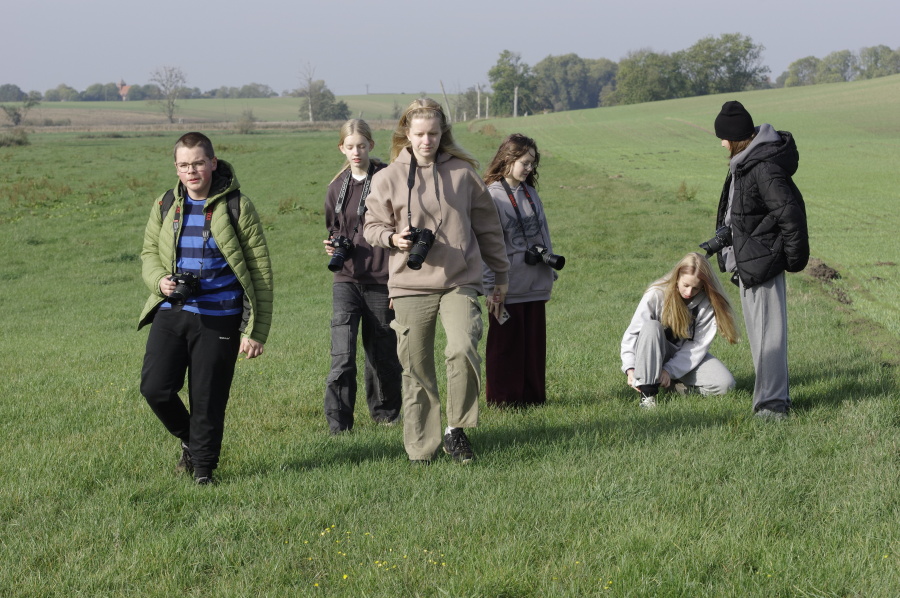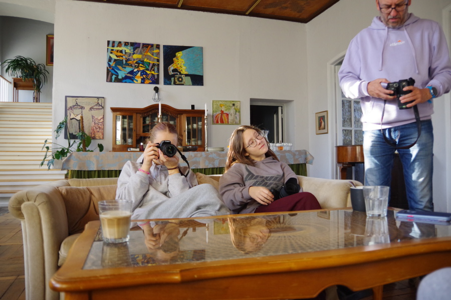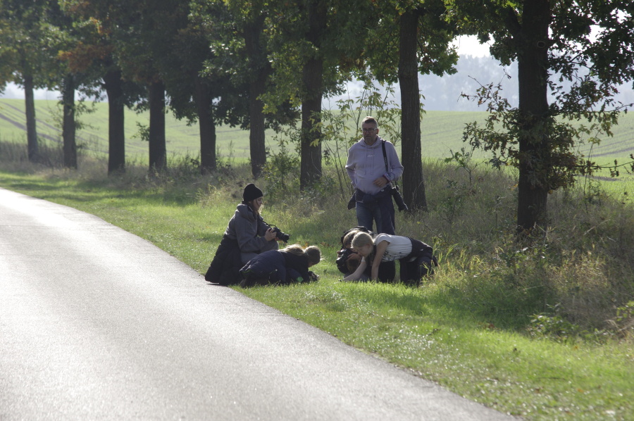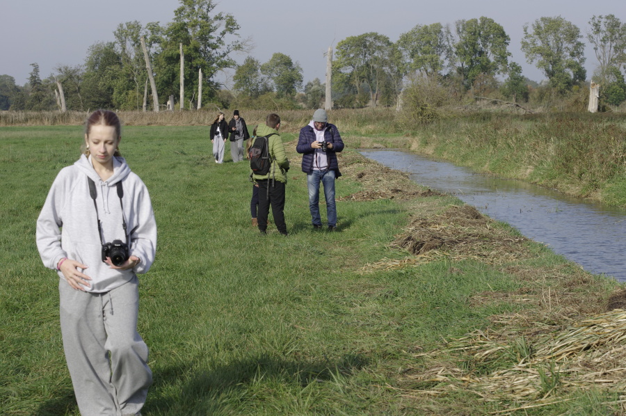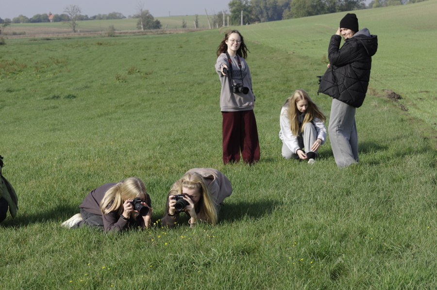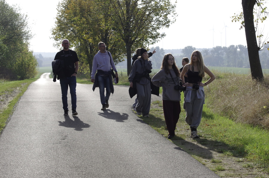 Piątek był dniem intensywnej pracy warsztatowej. Zaczęliśmy porannym plenerem w poszukiwaniu żurawi, majestatycznych ptaków zbierających się wśród okolicznych pól przed odlotem. Po żurawiach pozostały niestety tylko pióra, ale gonitwy z aparatami za sarnami wynagrodziły nam stratę. To była prawdziwa fotografia przyrodnicza. Na szczęście aparaty były wyposażone w obiektywy ze stosunkowo długimi ogniskowymi, co ułatwiło nam „polowanie”. Atrakcją okazały się również co rusz przelatujące nad naszymi głowami klucze dzikich gęsi czy rodziny żurawi zbierające się gdzieś w oddali za lasem gigantycznych wiatraków energetycznych. Można było dostrzec ogromną radość fotografowania wśród uczestników projektu. Każdy napotkany kwiatek, rosnący grzyb czy przelatujący ptak stawał się celem sesji zdjęciowej. Zrobiliśmy prawie 10 kilometrów po polach i okoliczny dróżkach przy pięknej pogodzie i nikt nie czuł zmęczenia.