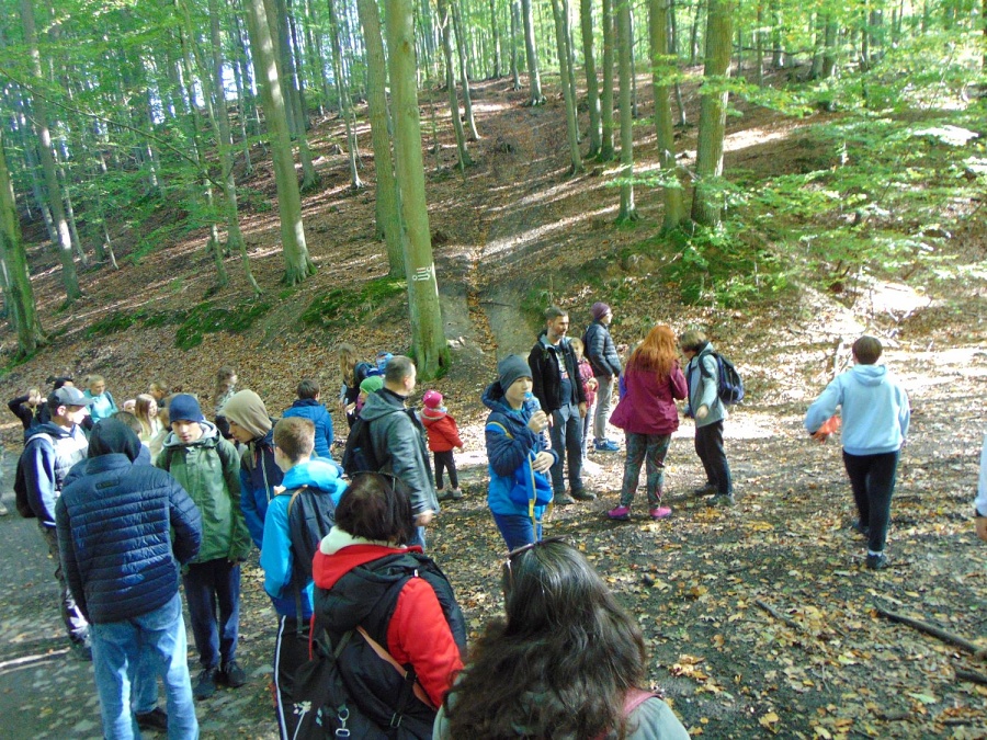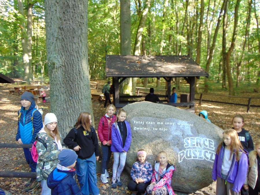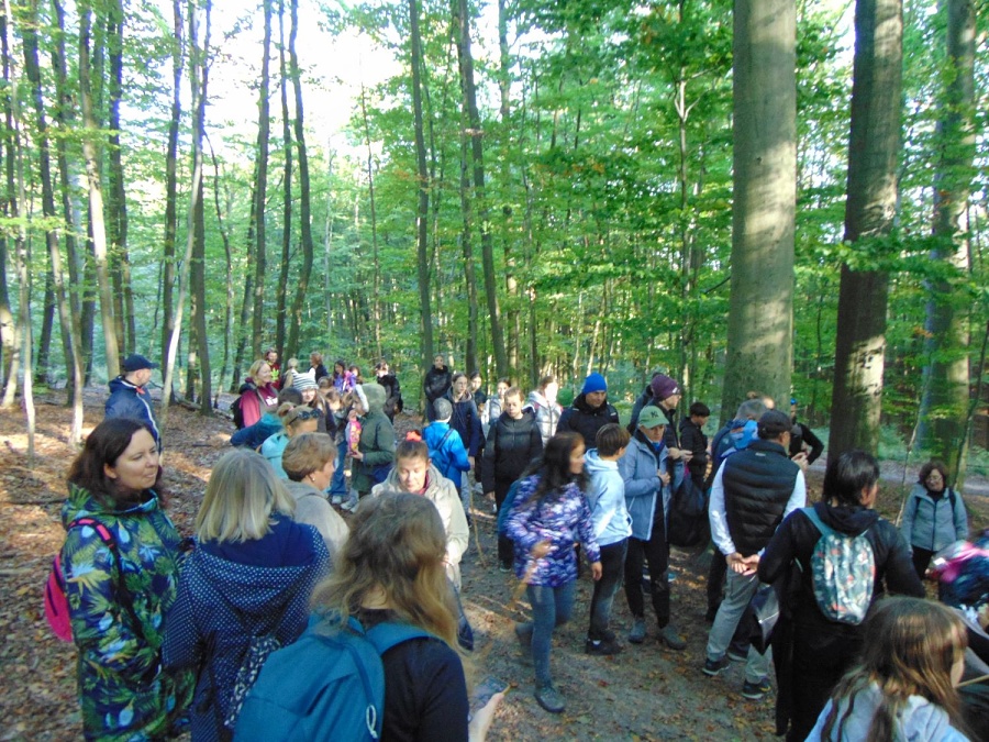 Na pętli Osiedle Bukowe zebrało się około 100 chętnych do wędrówki turystów. Celem był parking w Kołówku, na którym jest głaz „Serce Puszczy” z wyrytą inskrypcją: Tutaj czas ma inny wymiar. Zwolnij, tu bije… SERCE PUSZCZY. Głaz ustawiono tu w 2004 roku z okazji 80-lecia Lasów Państwowych. A w tym roku Lasy Państwowe obchodzą 100 rocznicę powstania. Czarnym szlakiem ruszyliśmy w stronę głazu Grońskiego. Następnie niebieskim szlakiem przeszliśmy do dębów Krzywoustego. Tu ma początek zielony szlak, który doprowadził nas do miejsca złazu.