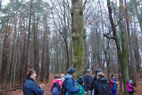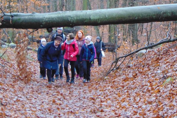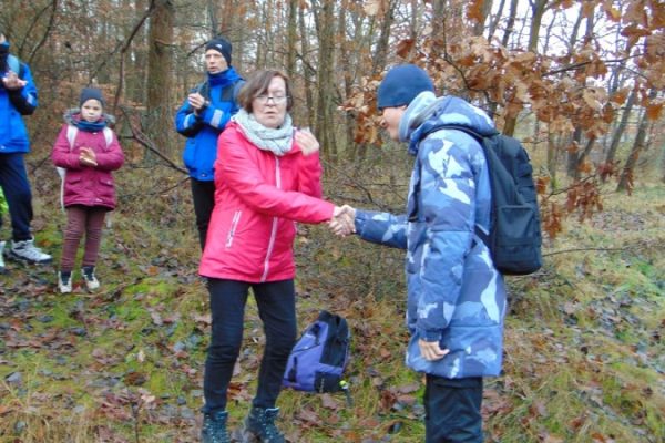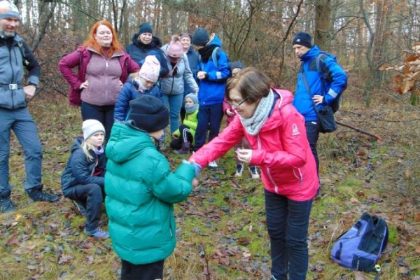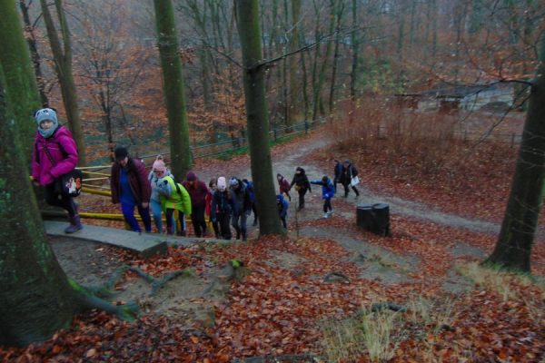Na trasie było trochę niespodzianek w postaci trudnych (śliskich) podejść i zwalonych drzew, które utrudniały przejścia. Z okazji Mikołajek wszyscy dostali po cukierku. Na polance Psie Pole był krótki odpoczynek, po którym ruszyliśmy żółtym szlakiem w dalszą wędrówkę. Gdy dotarliśmy do ulicy Smoczej, przeszliśmy obok dwóch okazałych dębów Wartowników w stronę strzelnicy. Stamtąd, kierując się znakami czerwonego szlaku, dotarliśmy do Polany Głuchej – miejsca złazu 1075 Leśnej Soboty.