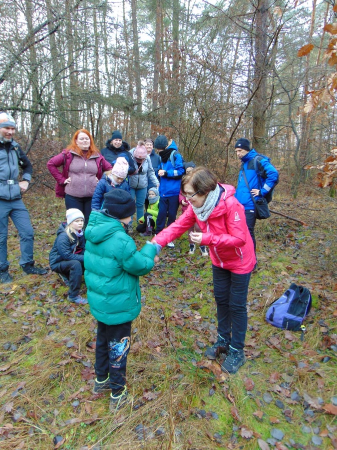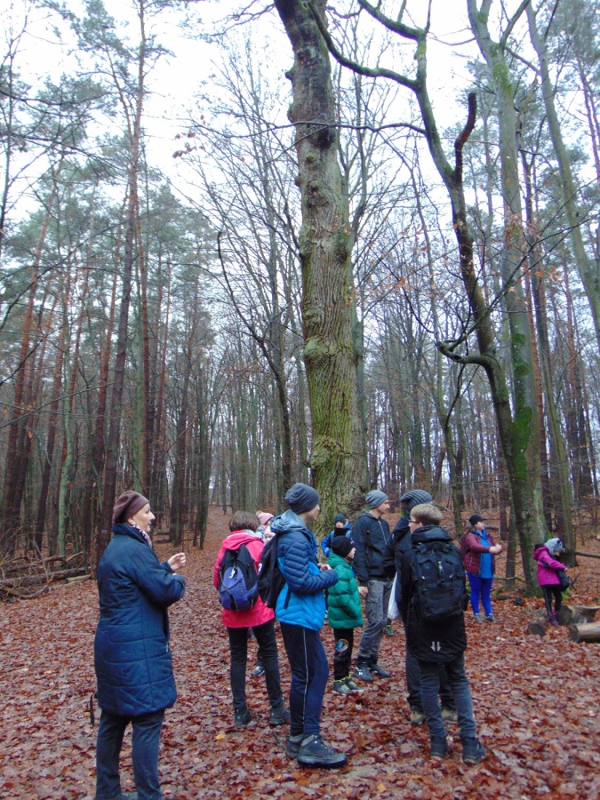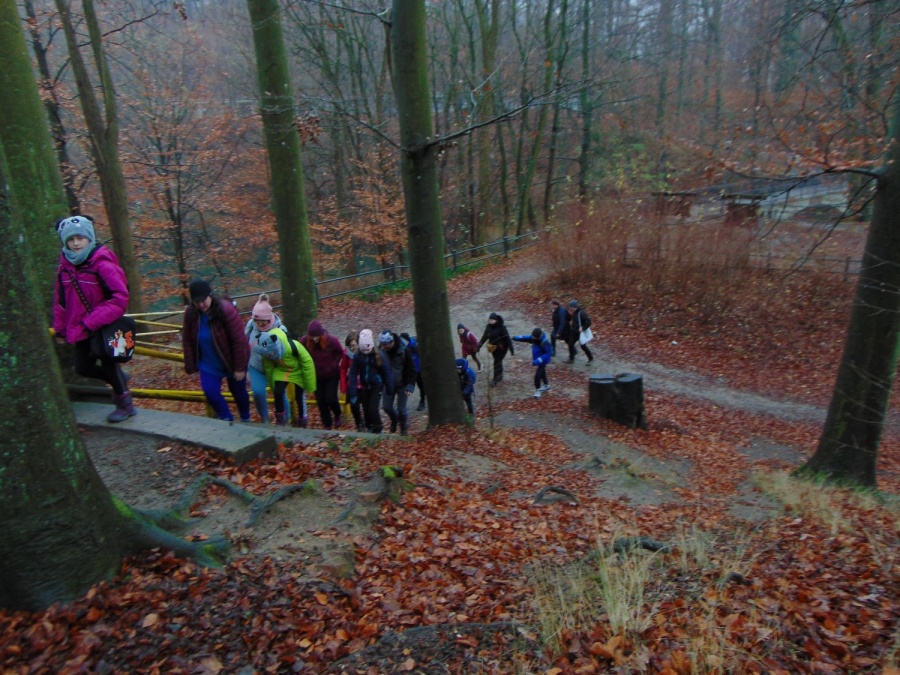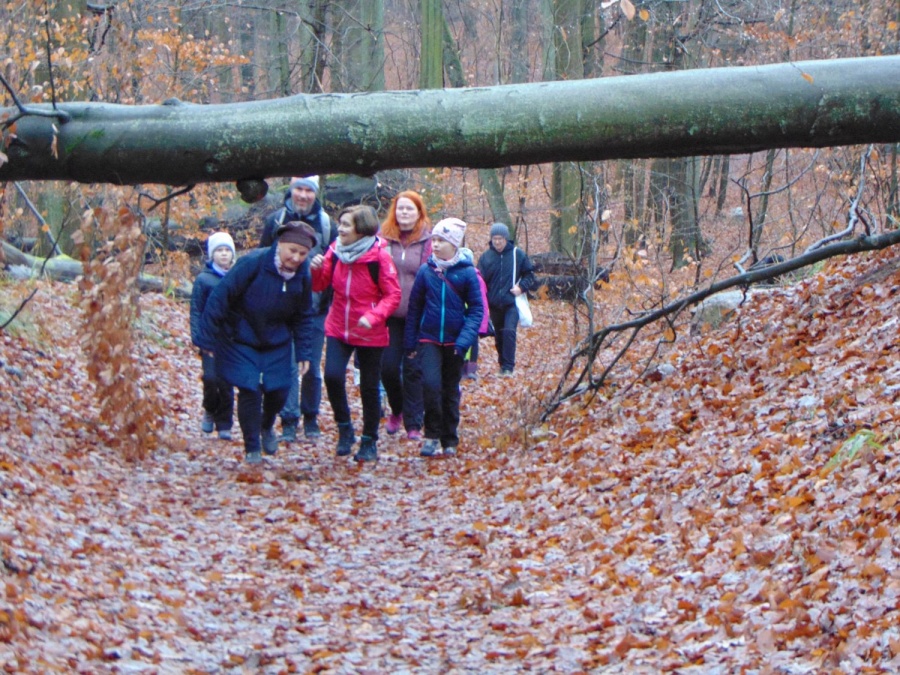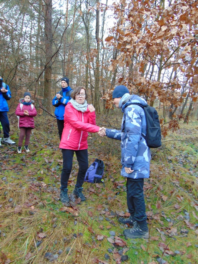 Na trasie było trochę niespodzianek w postaci trudnych (śliskich) podejść i zwalonych drzew, które utrudniały przejścia. Z okazji Mikołajek wszyscy dostali po cukierku. Na polance Psie Pole był krótki odpoczynek, po którym ruszyliśmy żółtym szlakiem w dalszą wędrówkę. Gdy dotarliśmy do ulicy Smoczej, przeszliśmy obok dwóch okazałych dębów Wartowników w stronę strzelnicy. Stamtąd, kierując się znakami czerwonego szlaku, dotarliśmy do Polany Głuchej – miejsca złazu 1075 Leśnej Soboty.