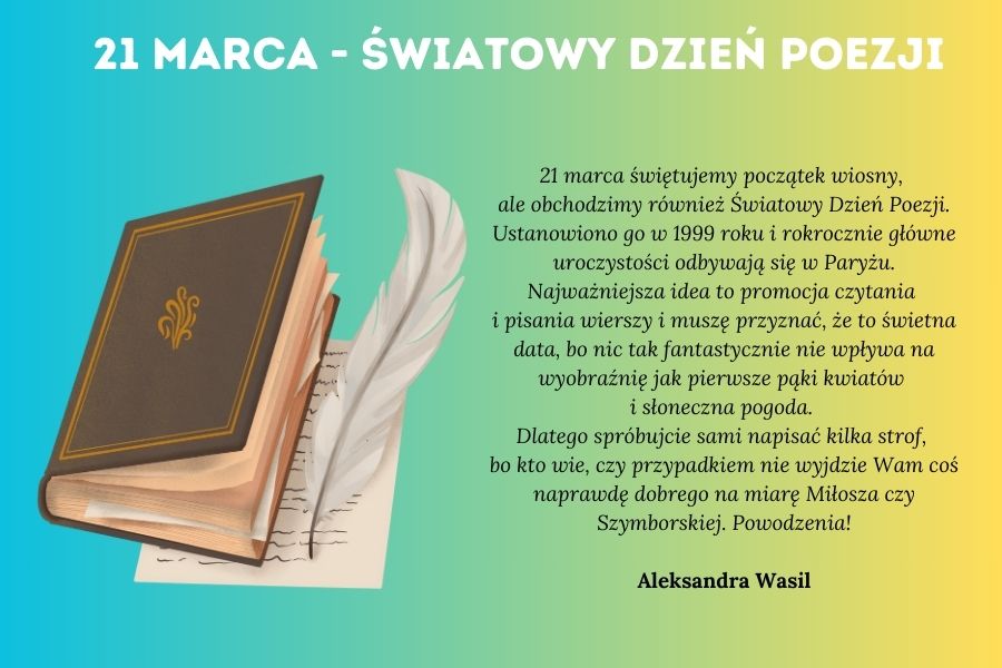 Światowy Dzień Poezji to święto słowa i wyobraźni. Tego dnia przypominamy sobie jaką moc mają wiersze, które potrafią wzruszać, inspirować i skłaniać do refleksji. Poezja łączy ludzi i pokazuje świat w nowym świetle. W tym dniu warto sięgnąć po ulubiony tomik albo samemu spróbować napisać coś własnego.