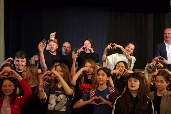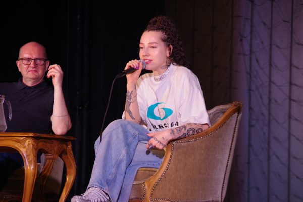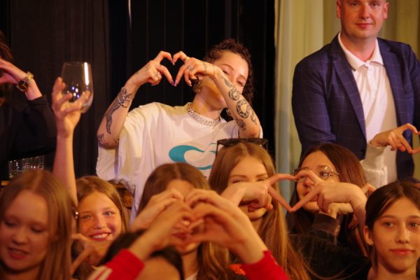 Faktycznie w auli wszystkie miejsca były dość wcześnie pozajmowane, bo punktualnie o tej godzinie miała zjawić się Sara Sudoł – raperka znana pod pseudonimem Young Leosia. Tak też się stało. Spotkanie z artystką miało formę długiej rozmowy, którą poprowadził pan Maciej Kiersznicki – realizator dźwięku oraz jej dawny nauczyciel – Dariusz Chmielewski, opiekun Pracowni Wokalno-Estradowej. Piosenkarka opowiadała o swojej drodze artystycznej, która rozpoczęła się w Pałacu Młodzieży, o tym co najbardziej ceni w muzyce i co czuje podczas koncertów.