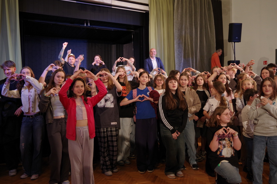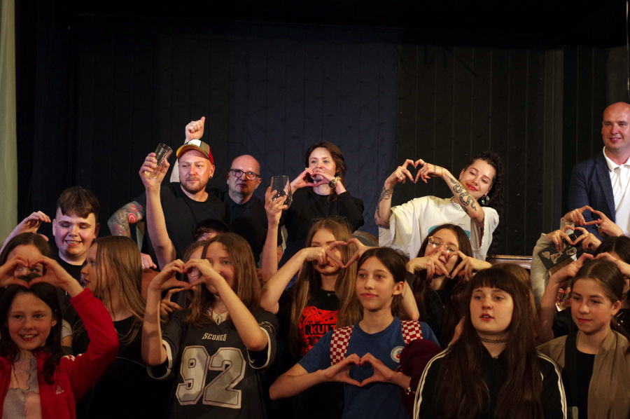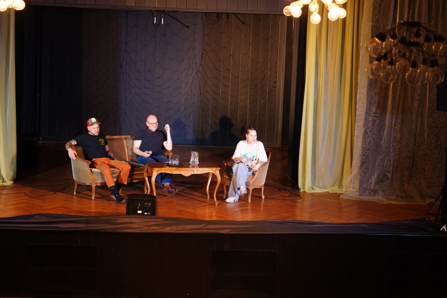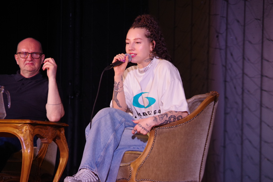 Faktycznie w auli wszystkie miejsca były dość wcześnie pozajmowane, bo punktualnie o tej godzinie miała zjawić się Sara Sudoł – raperka znana pod pseudonimem Young Leosia. Tak też się stało. Spotkanie z artystką miało formę długiej rozmowy, którą poprowadził pan Maciej Kiersznicki – realizator dźwięku oraz jej dawny nauczyciel – Dariusz Chmielewski, opiekun Pracowni Wokalno-Estradowej. Piosenkarka opowiadała o swojej drodze artystycznej, która rozpoczęła się w Pałacu Młodzieży, o tym co najbardziej ceni w muzyce i co czuje podczas koncertów.