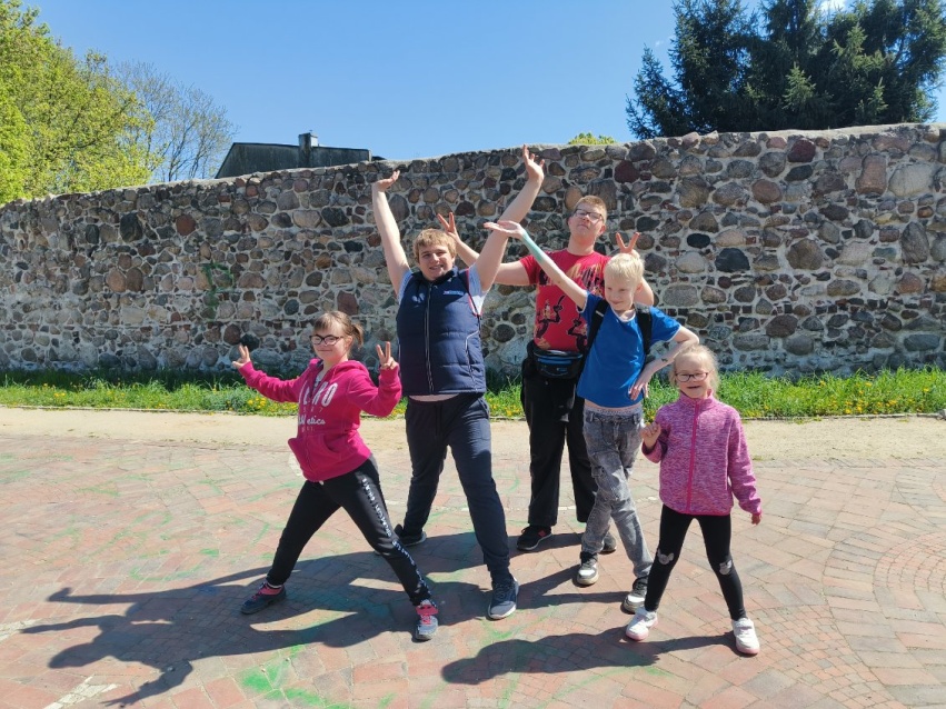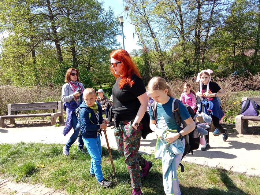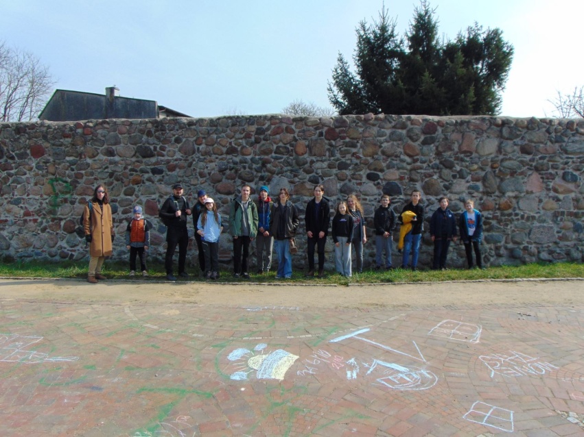 Następnie szliśmy ulicą Łąkową, a później ulicą Pomorską. Po przejściu nieco ponad jednego kilometra zatrzymaliśmy się nieopodal przejazdu kolejowego. Tutaj uczestnicy zostali podzieleni na szkolne grupy warsztatowe. Każdy zespół otrzymał kartę pracy i wykaz ulic, którymi należało się poruszać, aby znaleźć odpowiedzi na zadane pytania i bezpieczne dotrzeć na miejsce złazu. Tym razem meta zlokalizowana była przy średniowiecznych murach obronnych na ul. Cichej 2.