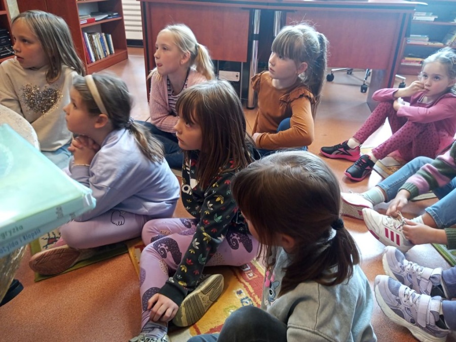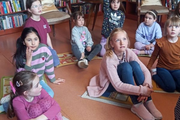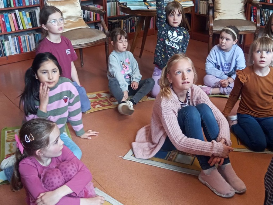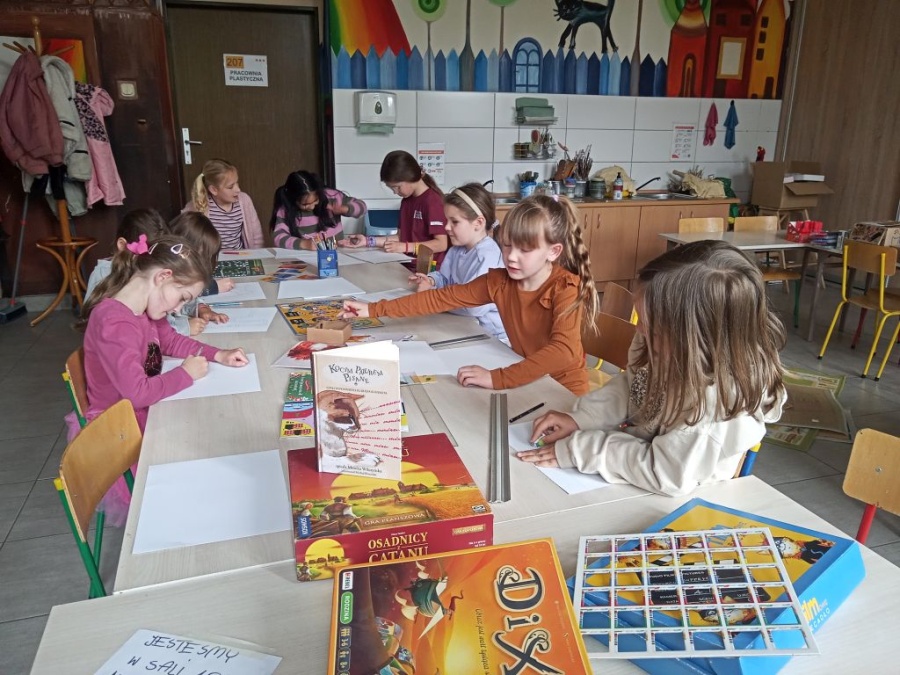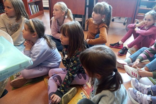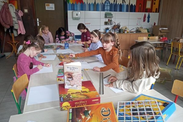 Jedna z pałacowych grupa plastycznych miała okazję spotkać się z autorką w pałacowej bibliotece. Poznaliśmy przygodę pewnego Kokosa, który sam zeskoczył z drzewa. Ilustracje Michała Brzezickiego pozwalały lepiej wyobrazić sobie przeczytane fragmenty. Pani Monika podzieliła się z dziećmi swoją historią budowania relacji z Rudolfem. Nasze małe spotkanie autorskie zakończyliśmy projektowaniem gier planszowych, które mogłyby stanowić dialog z książką.