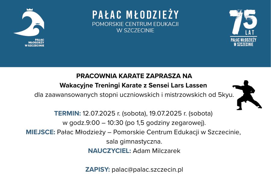 Wakacyjne treningi karate Pałac Młodzieży Opublikowano w 7 lipca, 2025 o 15:21 przez Dział Organizacyjny- Monika7 lipca, 2025 o 15:21 Pracownia Karate zaprasza na Wakacyjne Treningi Karate z Sensei Lars Lassen dla zaawansowanych stopni uczniowskich i mistrzowskich od 5kyu.