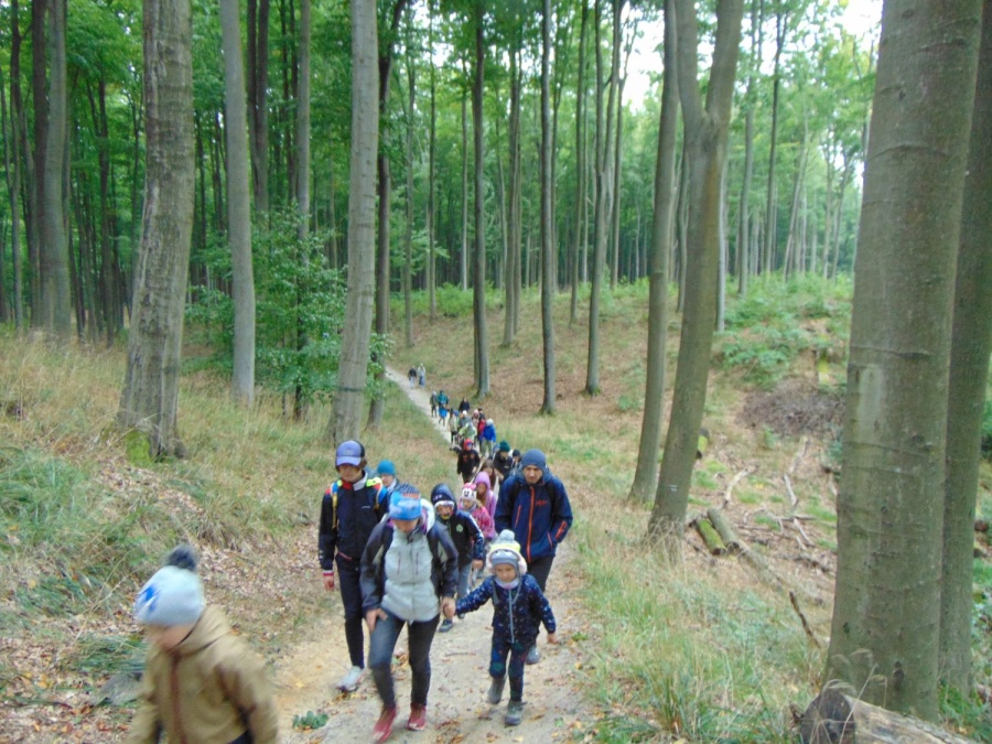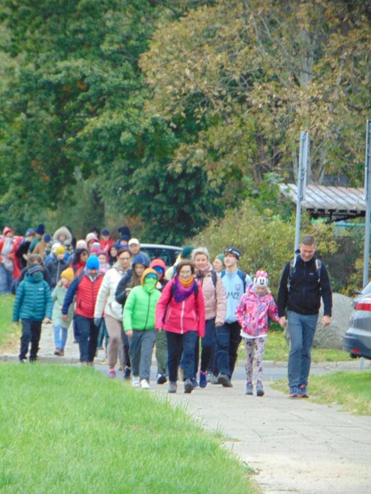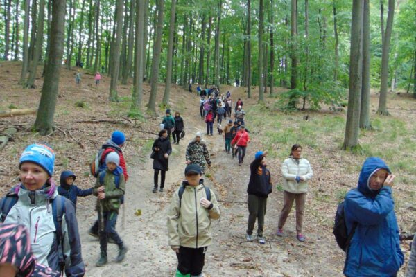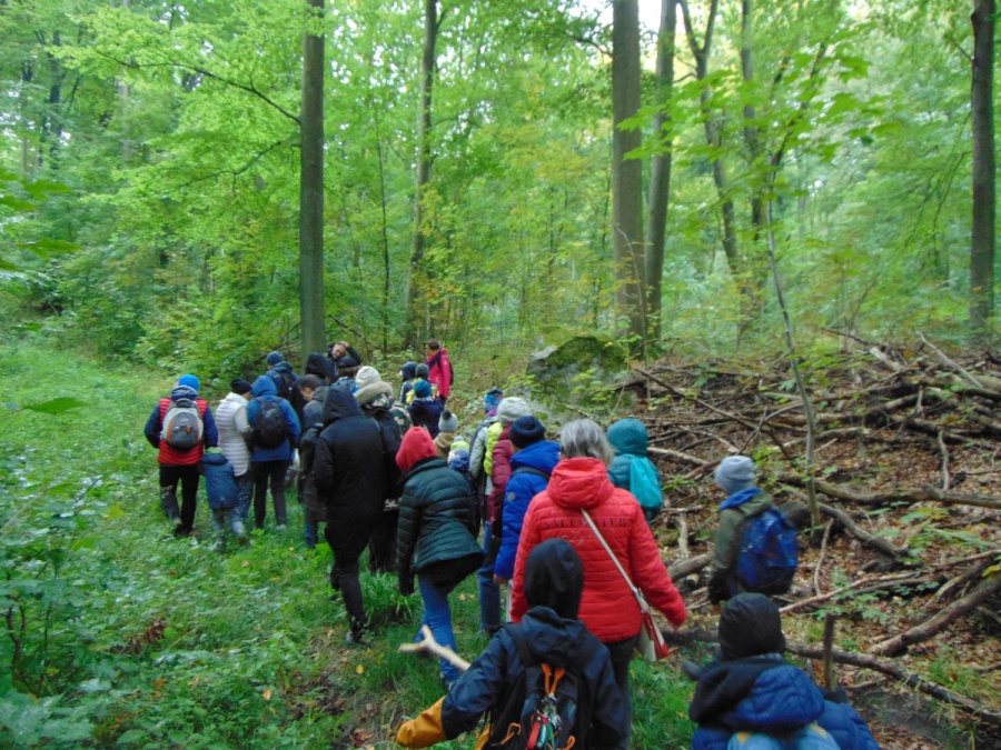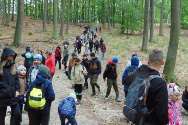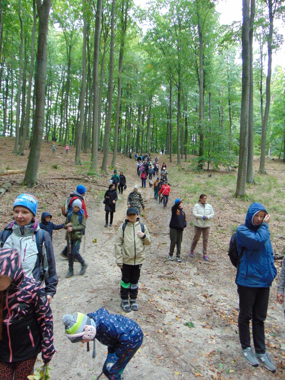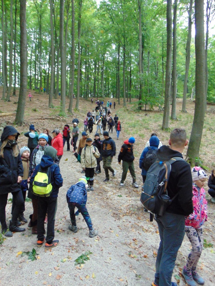 W sobotę, 4 października, wybraliśmy się na wędrówkę po Puszczy Bukowej. Na pętli autobusowej Osiedle Bukowe zebrało się ponad 90 zagorzałych turystów, dla których nie straszny wiatr i deszcz! Tym razem pogoda spłatała nam figla! Było zimno i mokro. Wędrówkę rozpoczęliśmy kierując się czarnym szlakiem do głazu Grońskiego. Stali bywalcy Leśnych Sobót znają to miejsce, a ci, którzy byli tu pierwszy raz usłyszeli trochę wiadomości o głazie. Potem ruszyliśmy dalej, w górę. Czarny szlak prowadzi bowiem na sam szczyt najwyższego wzniesienia w Puszczy Bukowej – Bukowca. Po drodze zatrzymaliśmy się przy następnym ciekawym głazie – Głazie Serce. Tutaj uczestnicy wysłuchali legendy o sercu lodowego olbrzyma z północy, które leży spokojnie w naszej puszczy, tysiące kilometrów od krainy olbrzymów. Zrobiliśmy tu sobie krótką przerwę na odpoczynek i regeneracyjny posiłek. Dalej powędrowaliśmy czarnym szlakiem do Siodła Zielawy. Stąd kierując się znakami czerwonego szlaku dotarliśmy do Słupiego Głazu, o którym wysłuchano dwóch legend.