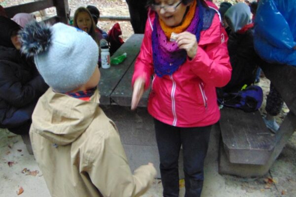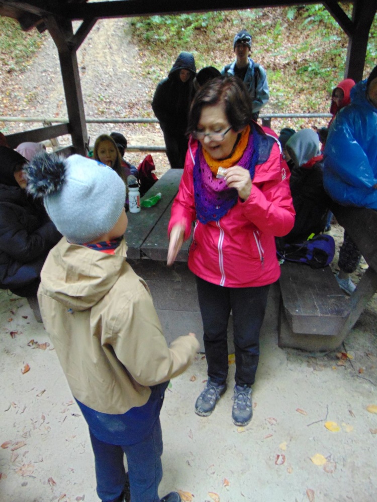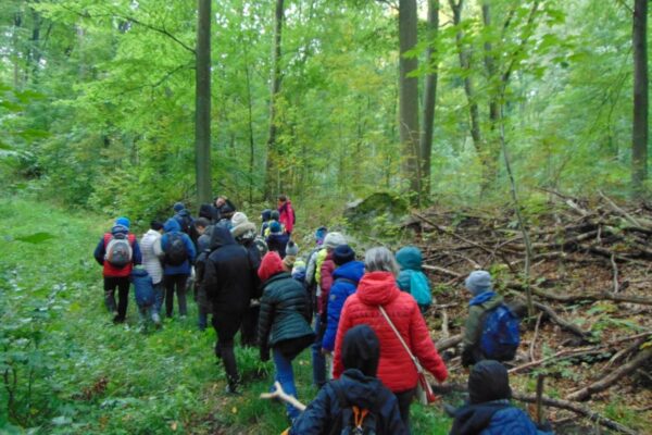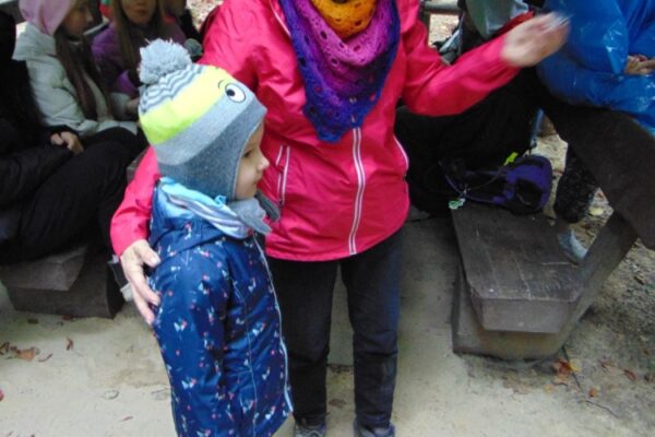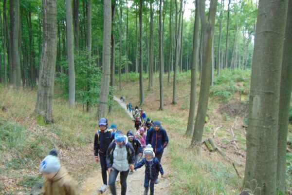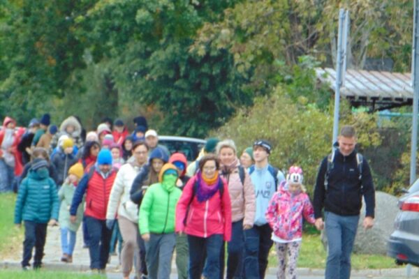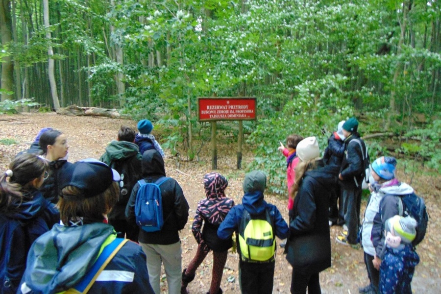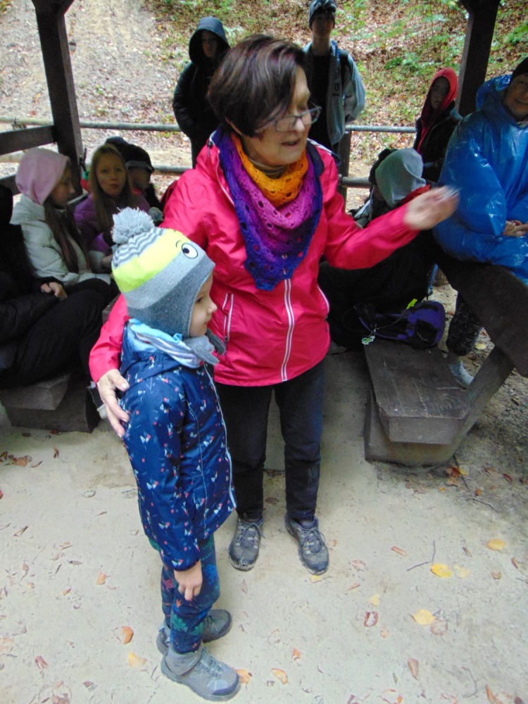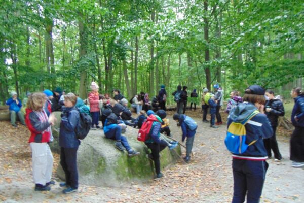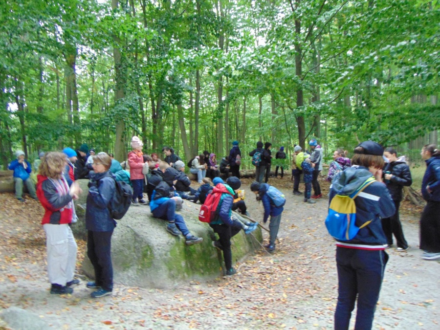 W sobotę, 4 października, wybraliśmy się na wędrówkę po Puszczy Bukowej. Na pętli autobusowej Osiedle Bukowe zebrało się ponad 90 zagorzałych turystów, dla których nie straszny wiatr i deszcz! Tym razem pogoda spłatała nam figla! Było zimno i mokro. Wędrówkę rozpoczęliśmy kierując się czarnym szlakiem do głazu Grońskiego. Stali bywalcy Leśnych Sobót znają to miejsce, a ci, którzy byli tu pierwszy raz usłyszeli trochę wiadomości o głazie. Potem ruszyliśmy dalej, w górę. Czarny szlak prowadzi bowiem na sam szczyt najwyższego wzniesienia w Puszczy Bukowej – Bukowca. Po drodze zatrzymaliśmy się przy następnym ciekawym głazie – Głazie Serce. Tutaj uczestnicy wysłuchali legendy o sercu lodowego olbrzyma z północy, które leży spokojnie w naszej puszczy, tysiące kilometrów od krainy olbrzymów. Zrobiliśmy tu sobie krótką przerwę na odpoczynek i regeneracyjny posiłek. Dalej powędrowaliśmy czarnym szlakiem do Siodła Zielawy. Stąd kierując się znakami czerwonego szlaku dotarliśmy do Słupiego Głazu, o którym wysłuchano dwóch legend.