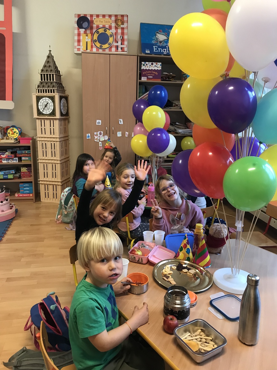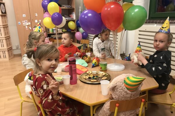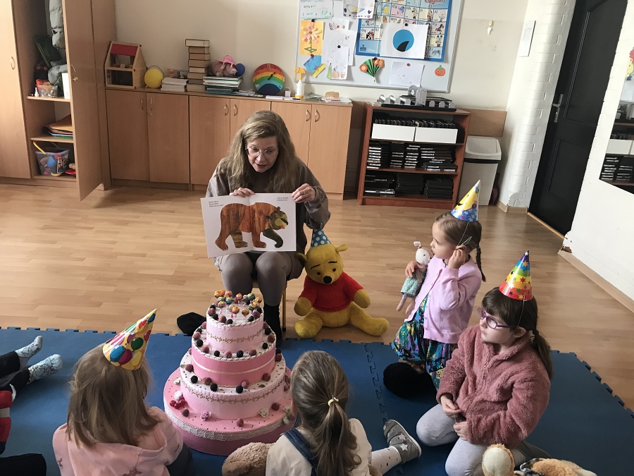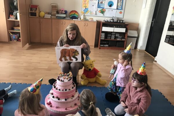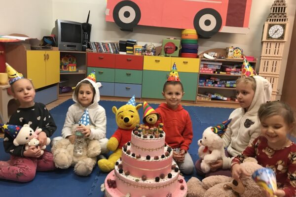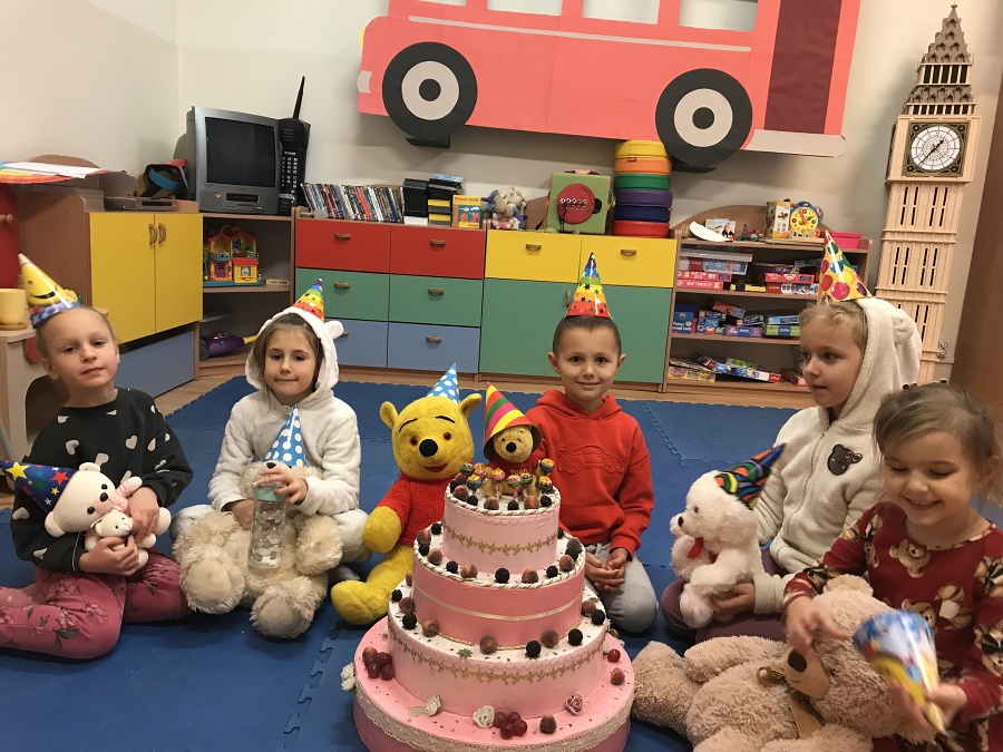 Na zajęciach Z Angielskim Przez Świat, dzieci obchodziły urodziny Misia. Przy tej okazji powtórzyły słowa związane z kolorami i częściami ciała. Zaśpiewały też oczywiście Misiom „Happy Birthday” oraz pobawiły się w „Stary niedźwiedź mocno śpi”.