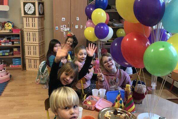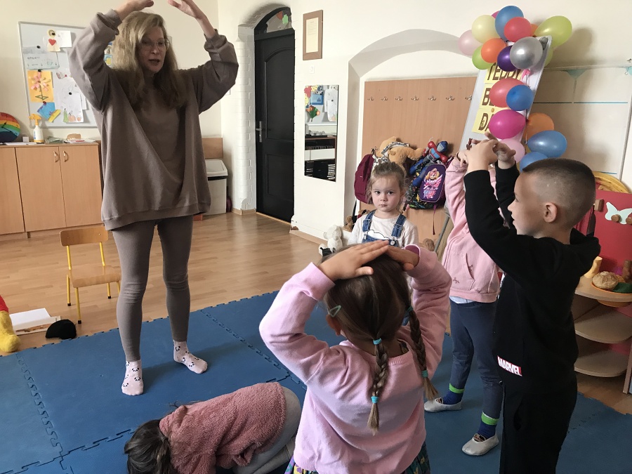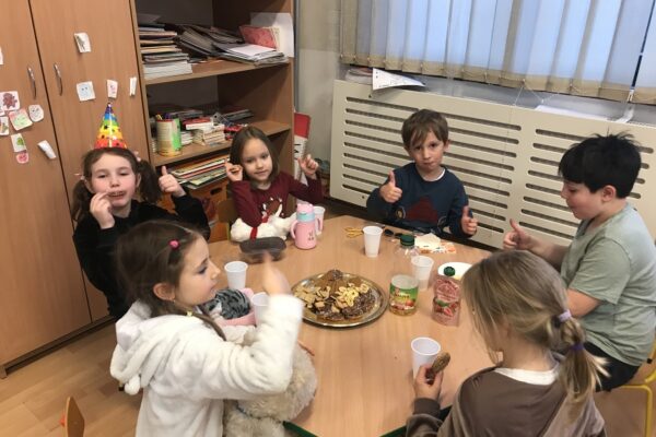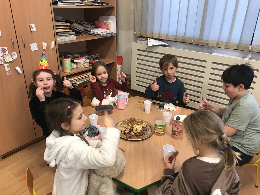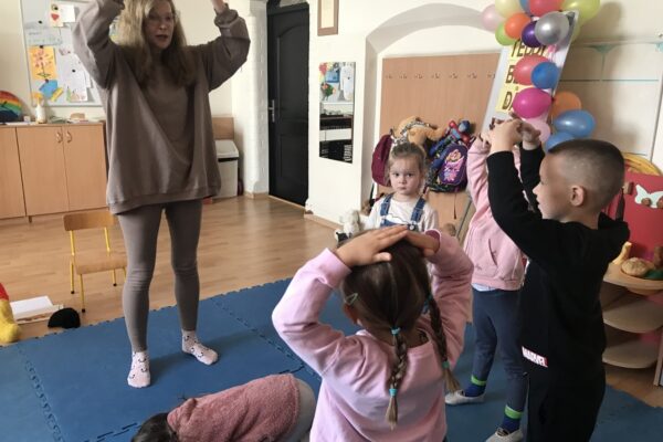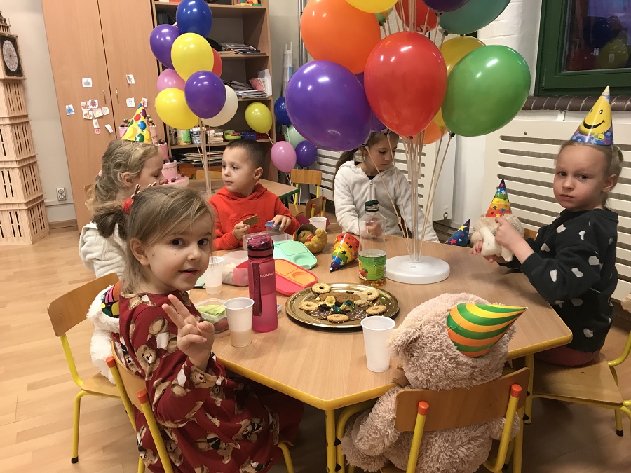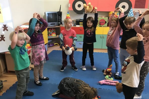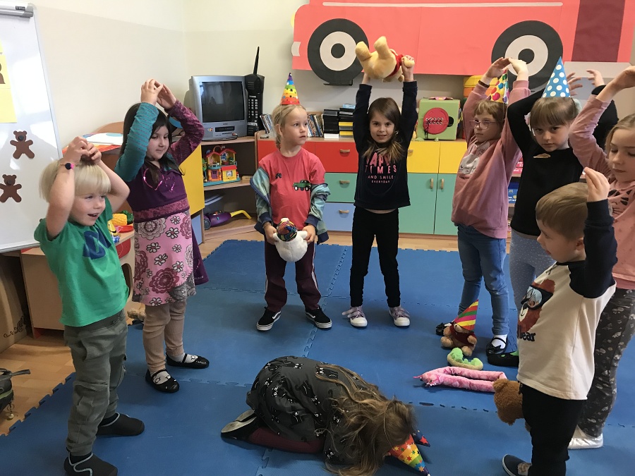 Na zajęciach Z Angielskim Przez Świat, dzieci obchodziły urodziny Misia. Przy tej okazji powtórzyły słowa związane z kolorami i częściami ciała. Zaśpiewały też oczywiście Misiom „Happy Birthday” oraz pobawiły się w „Stary niedźwiedź mocno śpi”.