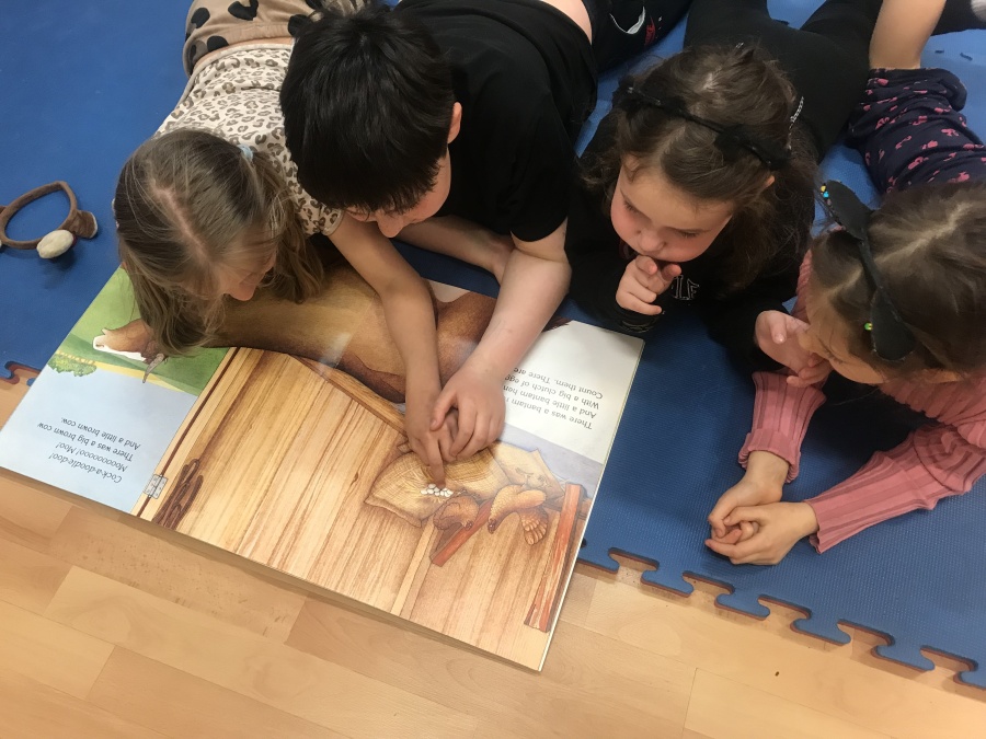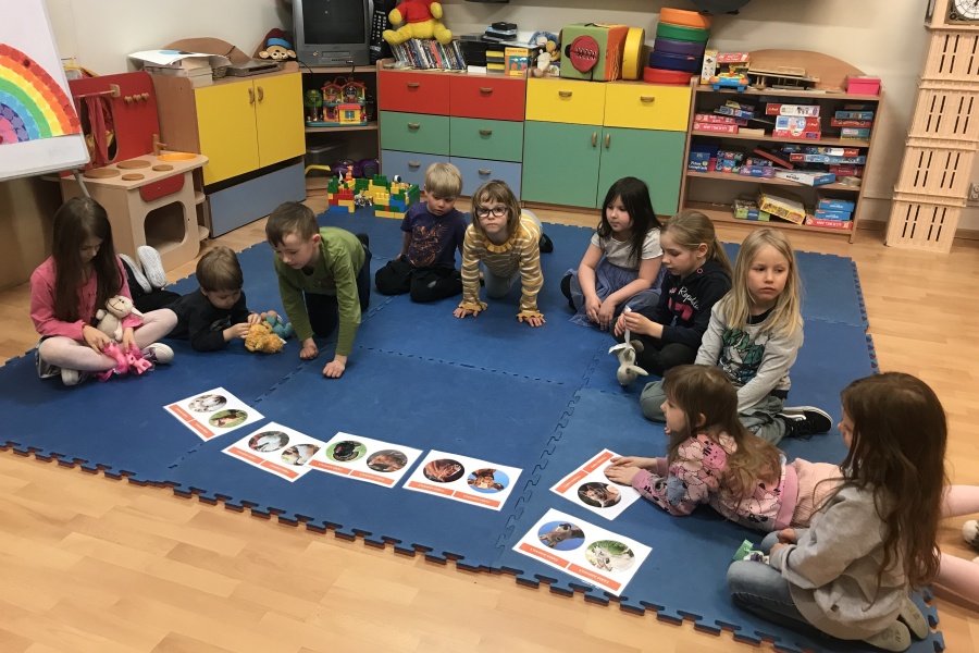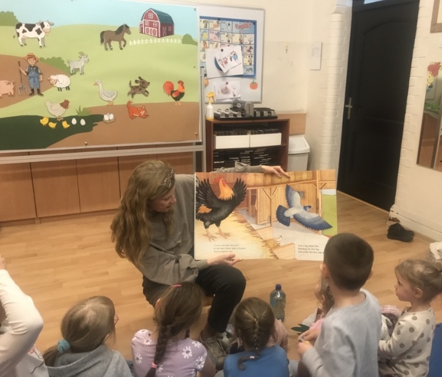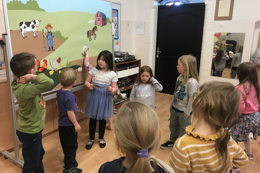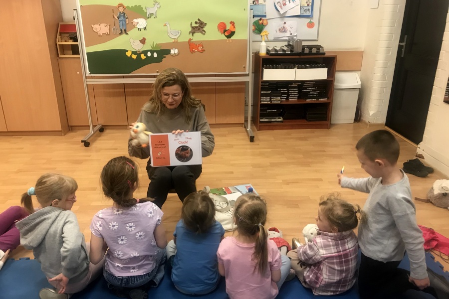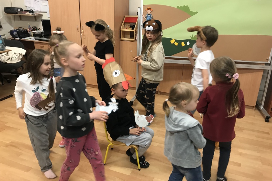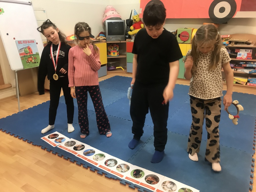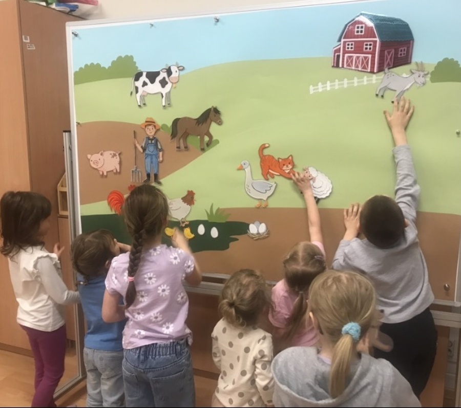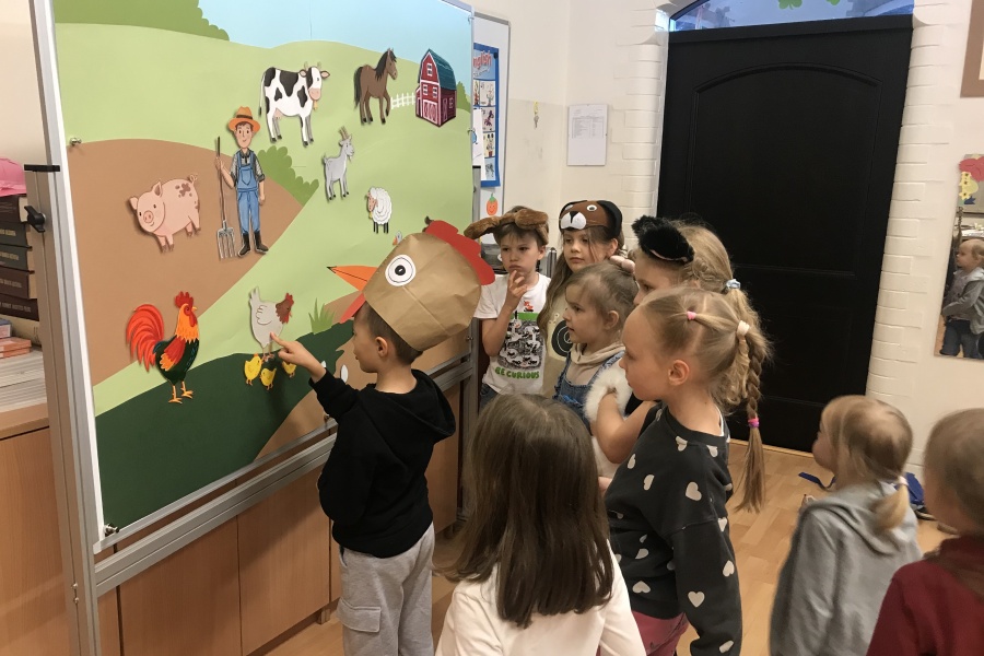 Podczas czytania książki pt. „The big red barn” poznały dużo zwierzątek oraz ich odgłosy. Były też zabawy przy tablicy interaktywnej, za której przygotowanie dziękujemy pani Ani Rink, naszej pałacowej dekoratorce! Na tablicy mamy dużo zwierząt, które zamieszkują farmę i dzięki niej uczymy się wielu nowych słów.