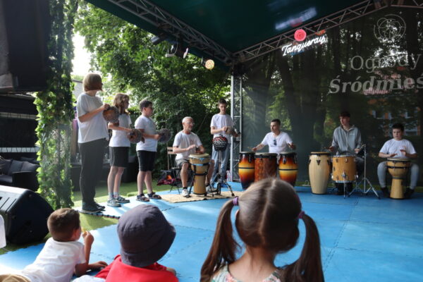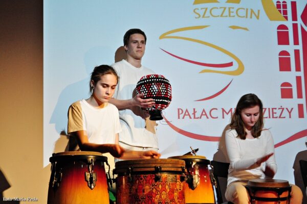 Uczniowie pod opieką nauczyciela doskonalą swój warsztat muzyczny poznając tajniki gry na różnych instrumentach perkusyjnych.