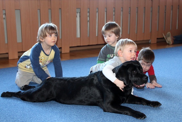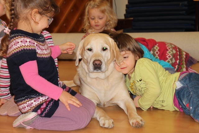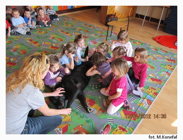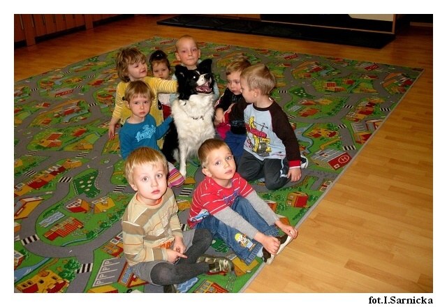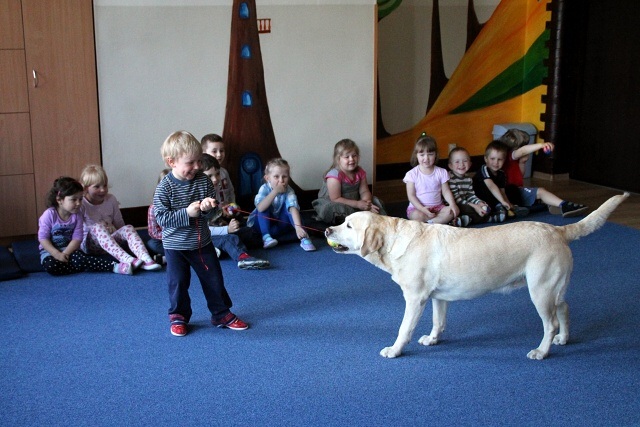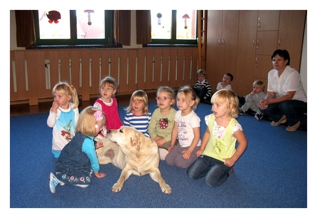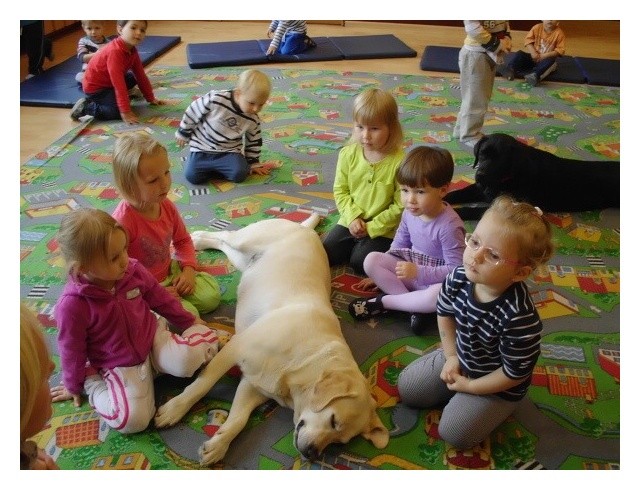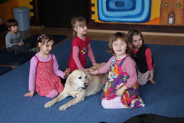 Raz w miesiącu dzieci z AEP odwiedzają czworonożni goście. Obecność psa zwiększa atrakcyjność zajęć, odpręża i relaksuje. Dzieci uczą się bezpiecznego kontaktu z psami, wzmacniają poczucie własnej wartości i pewności siebie, przełamują swoje lęki. Zabawy z czworonogami wzbudzają wiarę we własne siły i możliwości dzięki uświadamianiu własnych uczuć i przeżywaniu emocji. Nasze przedszkolaki uwielbiają zabawy z psami i zawsze z niecierpliwością oczekują ich kolejnej wizyty.