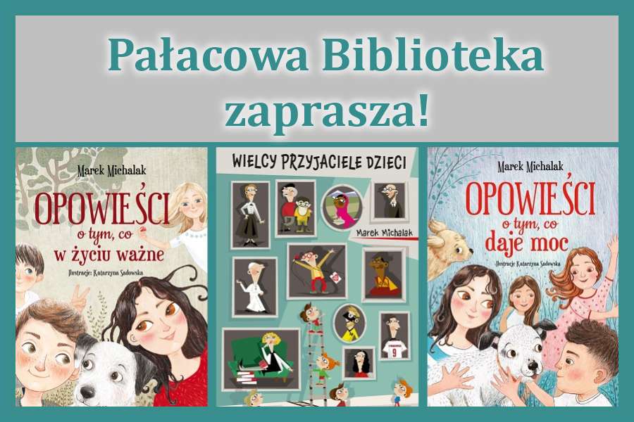 okładki książek z napisem Pałacowa biblioteka zaprasza